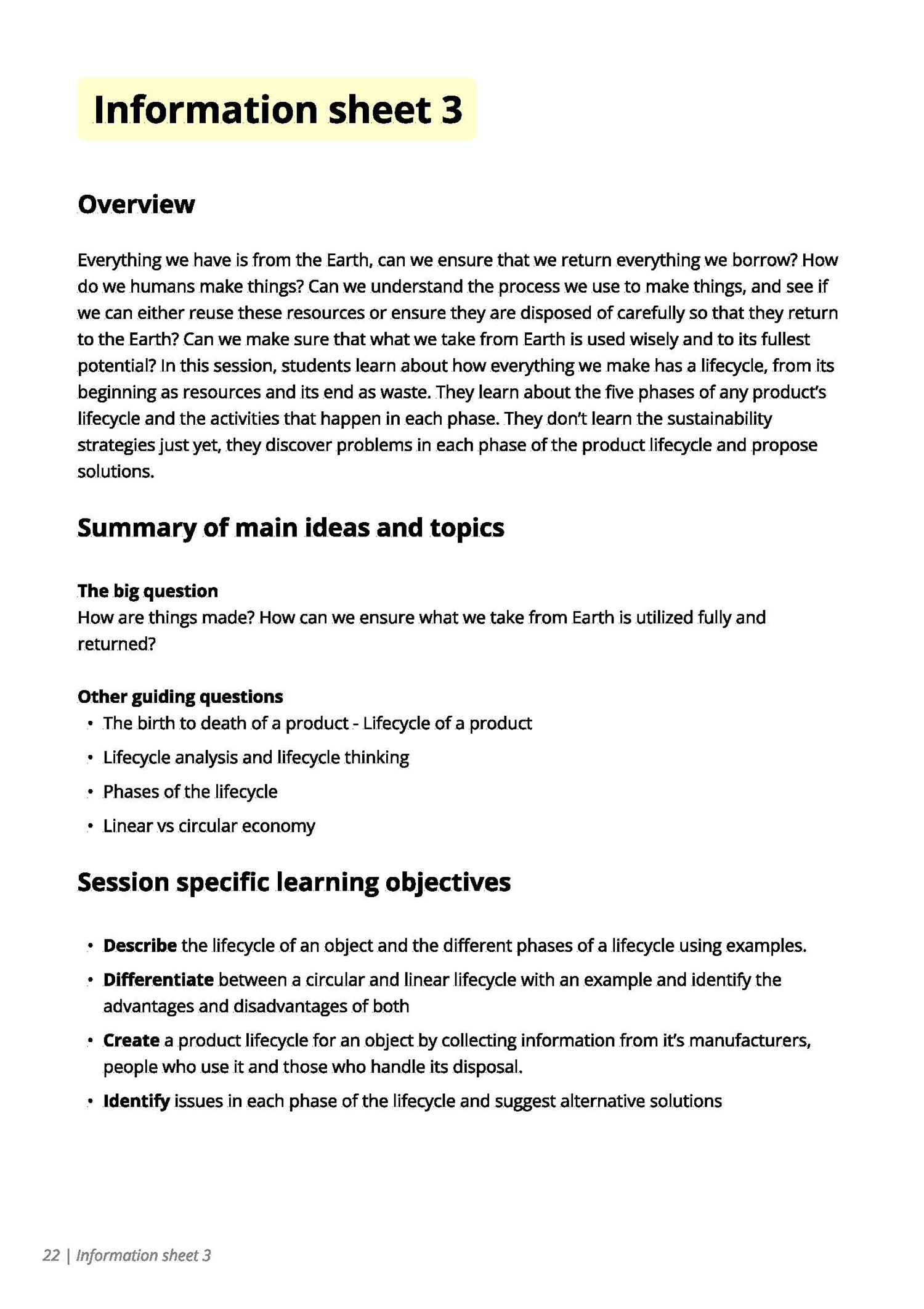The information manual contains all of the content to be taught to the students, in a more elaborated manner, for the teacher's reference. It has resources for further reading and also contains the materials which will be used for the class activities. The teacher is expected to go through the information sheet before each session to facilitate insightful discussions with the students during class discussions.