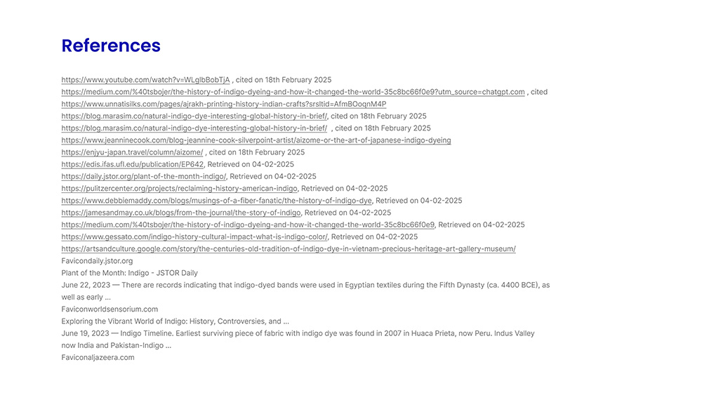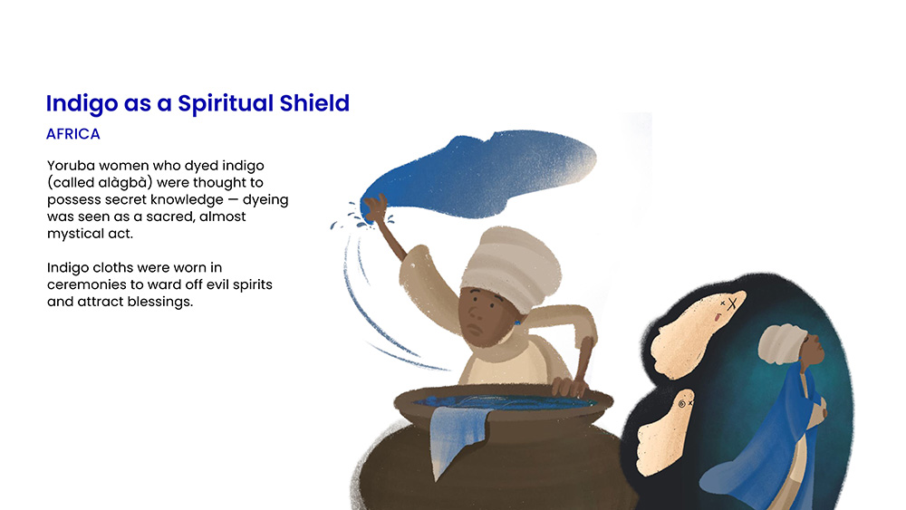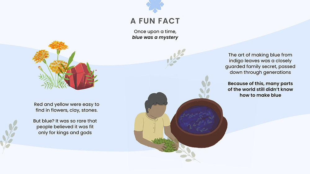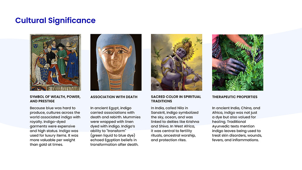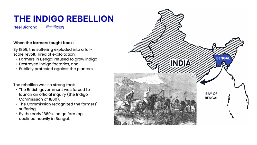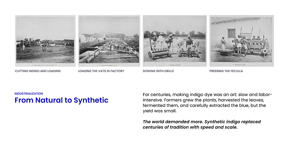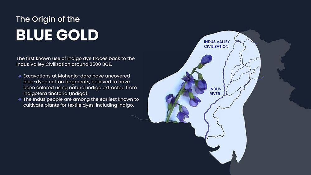 Swarangi Bhave, Madhura Kulkarni, Khushi Agrawal, and Saloni Rajput chose Indigo as the focus of their visual storytelling project, exploring its rich and layered history. Often called “blue gold,” indigo is far more than a dye, it symbolizes culture, trade, and transformation. Its origins date back to the Indus Valley Civilization around 2500 BCE, where blue-dyed cotton fragments highlight the early mastery of Indigofera tinctoria.