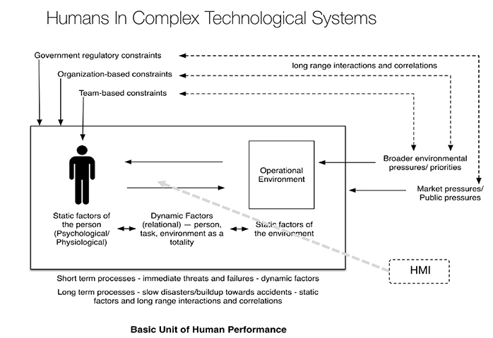 The second category deals with humans in relations with the immediate technologies — human machine interaction. This second category is the key idea that will be explored in this tutorial. Our main challenge is to design the human machine interface (HMI). It should be noted that the these complex technological sectors involve a heavy emphasis on the engineered dimension. This heavy technological focus imposes certain constraints on the activities of the users.  In other words, the HMI design challenge is to design in such as manner so as to balance both the technology and the human together. This will ensure through the process of design that the operator is efficacious in any given situation while ensuring overall systems safety. Human factors researchers have, therefore, emphasized the harmony between the humans and technologies by ensuring a “joint-optimization” of the two.