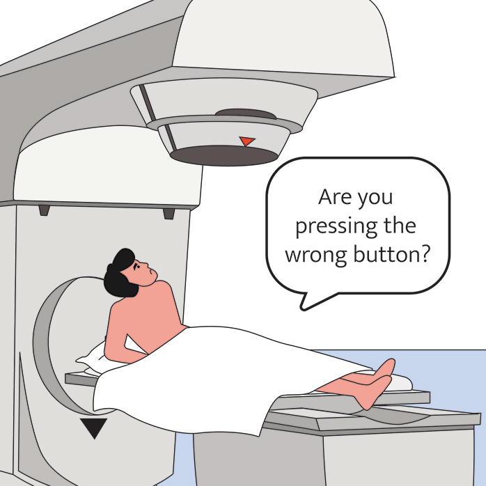 A moment later the machine shut down displaying "Malfunction 54", and the treatment paused indicating a problem of low priority. The monitor showed no dose being fired, clicked in for a round two of the treatment. The sheet on the side of the machine showed the malfunction as a “dose input 2” error.