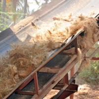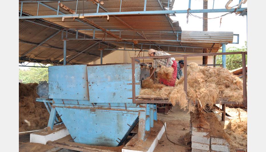 The dried husk is taken to the defibering process. The husk is directly sent into the defibering machine. The machine separates the fiber from the husk. This extracted husk is again refined to remove the impurities and the hard coconut skin. A different machine is used to refine the husk. The refined husk is gathered and piled which is again sent for the twine making process.
