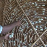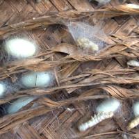 Sericulture, or silk farming, is the rearing of silkworms for the production of raw silk. Silkworm larvae are fed mulberry leaves, and, after the fourth molt, climb a twig placed near them and spin their silken cocoons. The silk is a continuous-filament fiber consisting of fibroin protein. Single filaments are combined to form thread. This thread is drawn under tension through several guides and wound onto reels. The threads may be plied together to form yarn. After drying the raw silk is packed according to quality.