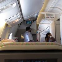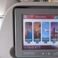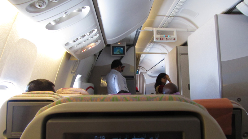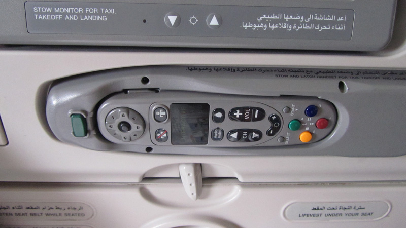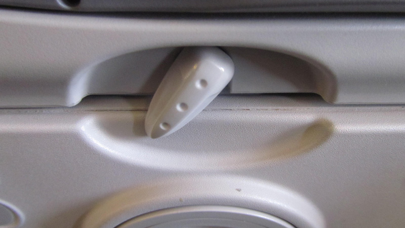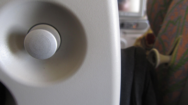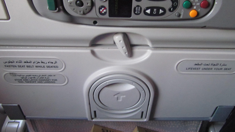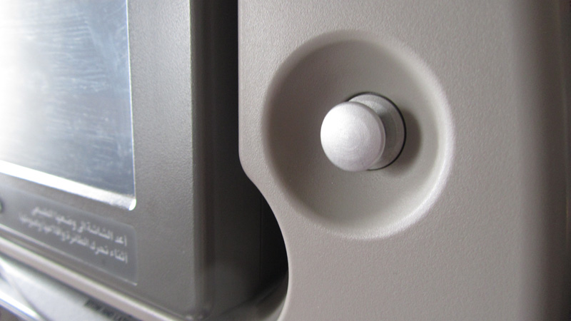 These are view of design details inside a Boeing 777. The artifacts belong to the economy section of Emirates Airlines.
