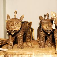 The term "Dhokra" is believed to be deriving from the word "dhokna", which means to cast. "Dhokra Shilp" is the regional word for the craft of bell metal casting. It is one of the most distinguished craft of Chattisgarh. It is also famous for its traditional lost wax technique which has been carried forward since thousands of years of its origin. Artifacts similar to the present craft form have been discovered at the sights of Mohenjedaro and Harappa. Dhokra shilp is widely practiced by the Ghadwa community of Bastar. The handcraft includes traditional ornaments, animal and tribal figures, idols of the local deities, which are most popular in the region. Earlier bell metal crafts were used for ritualistic and daily use purposes only. Figurines of local deities in various sizes, lamps and utensils were made. Idol of Danteshwari Mata, most worshipped Goddess by the Gond tribal's of Bastar, was most the common product. Figurines of lovers "Jhitku Mitki", the local legend, are also amongst one of the favorites. Animal figures of horses, elephants and nandi are very popular amongst the craft lovers. Accessories like bell, oil lamps, incense stick holder and utility products like grain containers are the most saleable artifacts. Also intricately decorated necklace, anklet, bracelet and earrings can be seen in the craft market. Traditional ornaments are the most decorative products of Dhokra.
