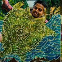 This installation, portraying the incarnations of Vishnu in ten avatars, shows the evolution of life forms on this earth. These various avatars also symbolise the triumph of the good over evil and yet at another level, the ten avatars illustrate the various stages of the human in its passage from the infant to the adult. The installation consists of ten panels of increasing heights. There is also an evolution in terms of the illustration styles used, where the first four animal stages are depicted using a style that has just basic lines, while the next five stages use solid colours. And the very last avatar is depicted in a futuristic manner. The various incarnation of Vishnu have been portrayed with a slot left open where one can insert one’s head and get photographed. This way, one can relive the stages of life by crouching to place one’s head in the first stage,to be followed by progressively rising panels.
