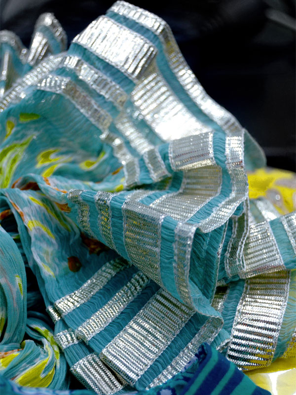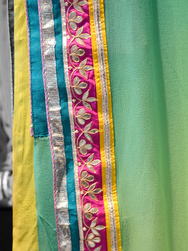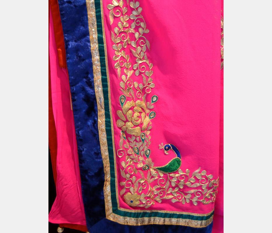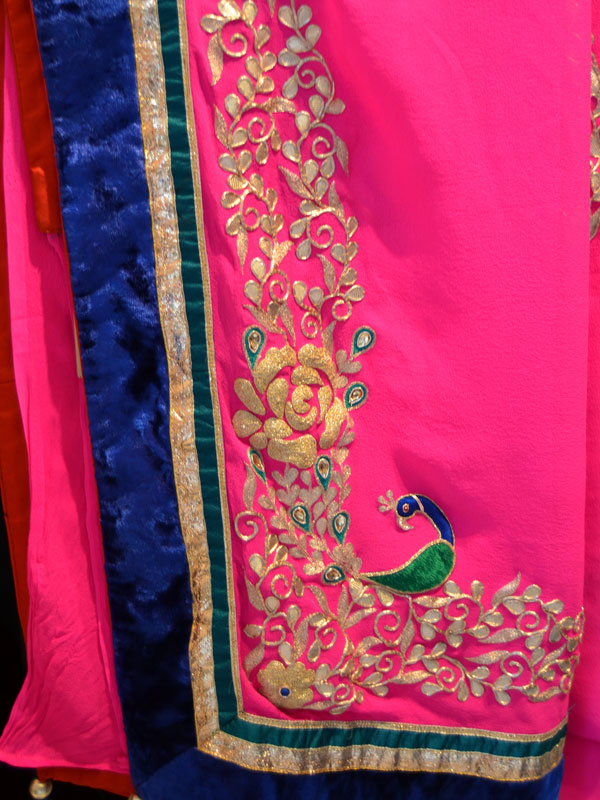 Gota work is essentially used for making women's formal costumes light in weight and rich in look. The master-karigars of this craft take great pride in their work and are a balanced mix of Hindus and Muslims. Traditional articles include turbans, lehenga-cholis, sarees, salwar kameez and dresses. Contemporary ones include kurtis, tops, skirts, dupattas, stoles, cushion covers, mobile covers and decorative panels. Predominant colors are hot pink, blood red, bright orange, fresh green and electric blue.