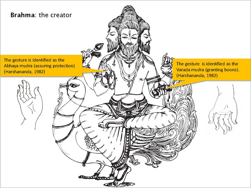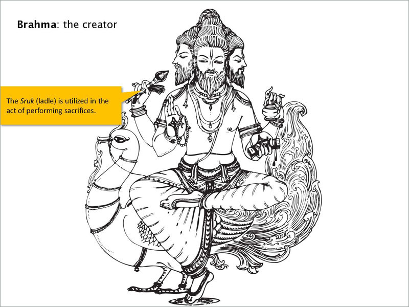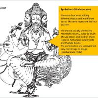 Imagery in Hinduism is preserved in its mythology. It is difficult to fully appreciate the iconography of images from the Hindu tradition without identifying with the philosophy behind it. A myth here is not easy to understand, but the code of myth can be broken by symbols. Symbols of a deity make up a pictorial script. Brahmā, the first of the three great Hindu gods, is the maker and father of all gods and men. He is the boundless immensity, from which space, time and causation originate. In the Mahābhārata, and Purānas, Brahmā is said to have sprung from the lotus originating from the navel of Vishnu. The Vishnu Purāna mentions the word Brahmā as derived from the root vriha (to increase), because it is infinite (spirit), and because it is cause by which the Vedas (and all things) are developed (ibid). He is equipped with all the know-how required for him to perform the task. His consort is Saraswati the goddess of knowledge.