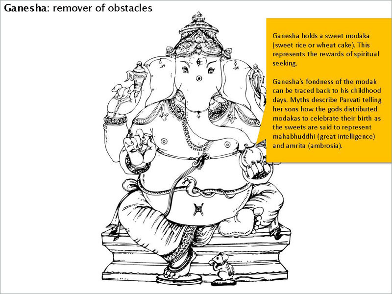 Imagery in Hinduism is preserved in its mythology. It is difficult to fully appreciate the iconography of images from the Hindu tradition without identifying with the philosophy behind it. A myth here is not easy to understand, but the code of myth can be broken by symbols. Symbols of a deity make up a pictorial script. Ganesha or Ganpati is the lord of obstacles. The elder son of Shiva and Parvati, he is know by many names some of which are Vinayaka, Vignesvara, Gajānana (one having the head (= ānana) of an elephant (= gaja). Ganesha is worshipped before undertaking any task, as he has the power to remove obstacles. An important from of Ganesha is Mahaganapati. In this form he has ten hands, each holding objects bestowed by ten deities. Among these are the fruit of the citron tree, associated with Shiva, the sugar cane bow, a gift from Kama (god of love), an arrow of a rice shoot, a gift from the earth, Varaha's mace and Vishnu's discus.