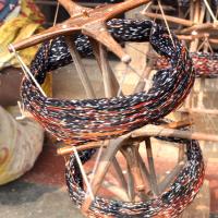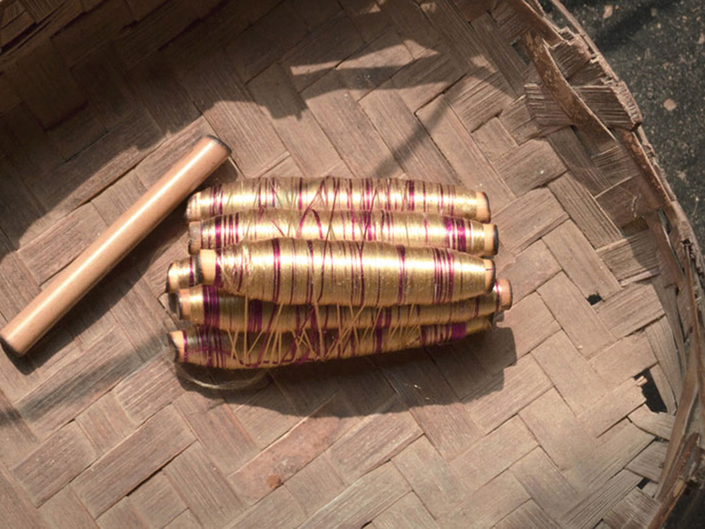 • Dyed weft yarn wound on a small wooden charkha.