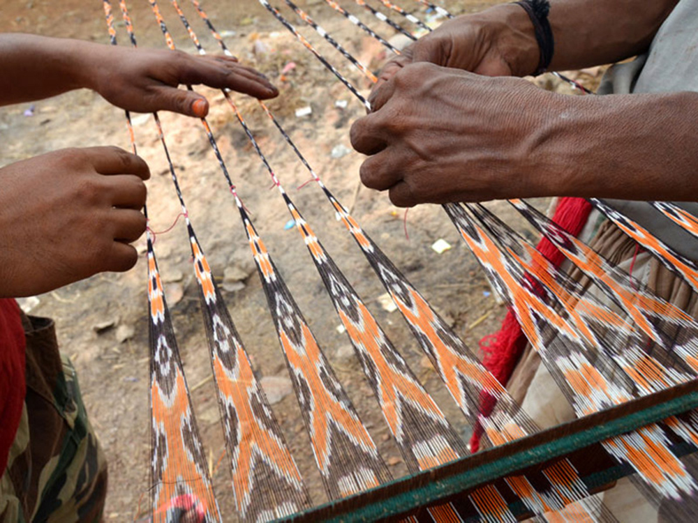 • Craftsmen opening up the dyed weft yarns.