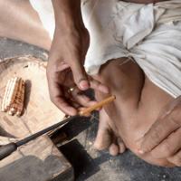 A Craftsman transferring single strands of silk on the spindle.