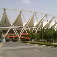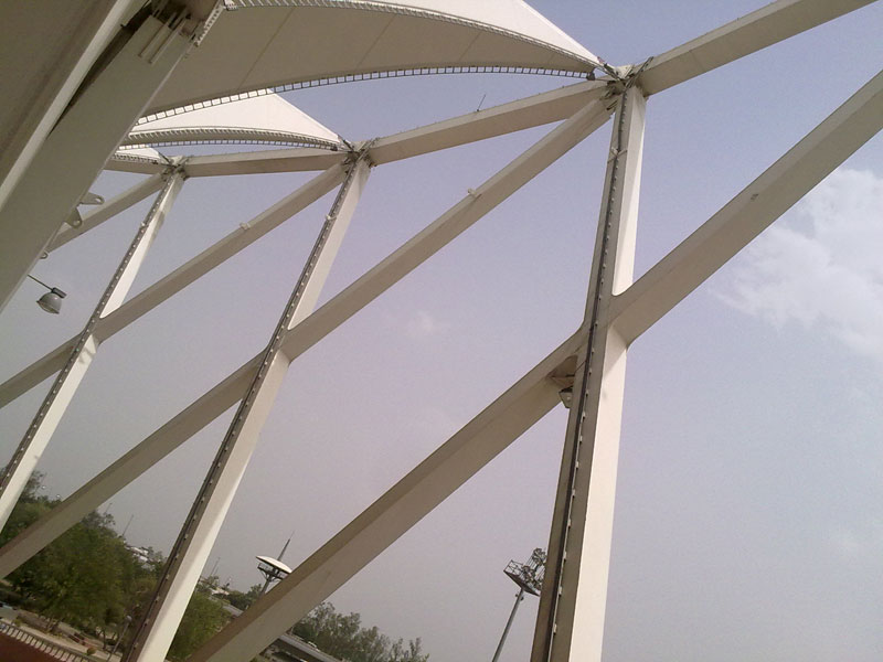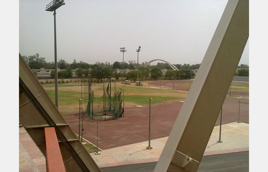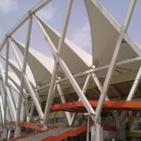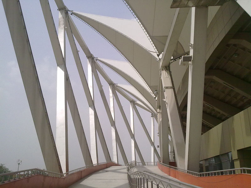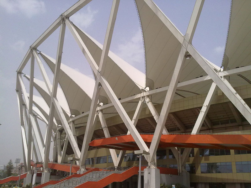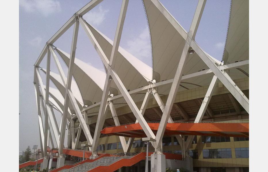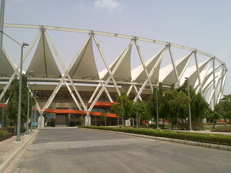 The main stadium has two outer basket-like supporting columned structures carrying not only the compression rings but also the complete ramp system for access and evacuation. The 53,800 m² Teflon-coated roof, designed by Schlaich Bergermann & Partner, was built at a cost of Rupees 308 crore. Taiyo Membrane Corporation supplied and installed the PTFE glass fibre fabric roof. 8,500 tonnes of steel were used in the construction of the stadium's roof and its support structure. A new Electro-Voice professional audio system by Bosch Communications. A new 10-lane synthetic track, synthetic warm-up track, and a synthetic lawn ball field were added. In case of emergency, the construction allows spectators to evacuate within 6 minutes.