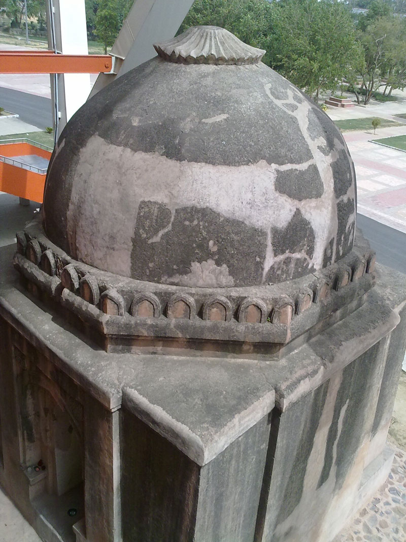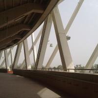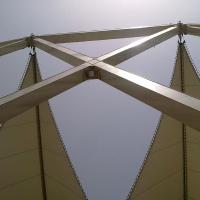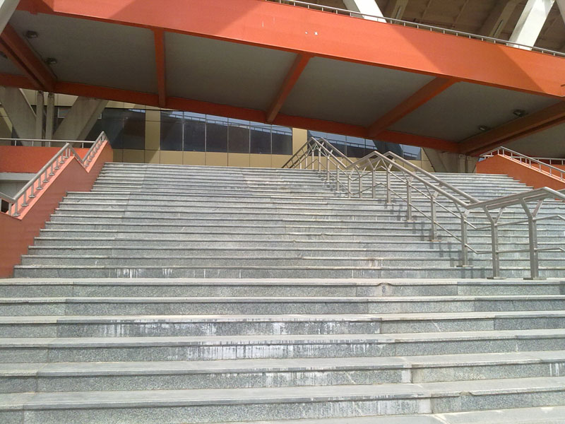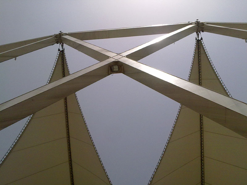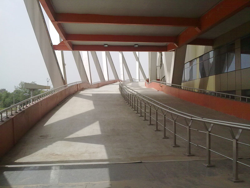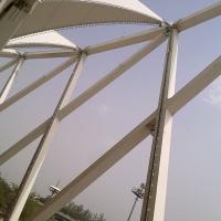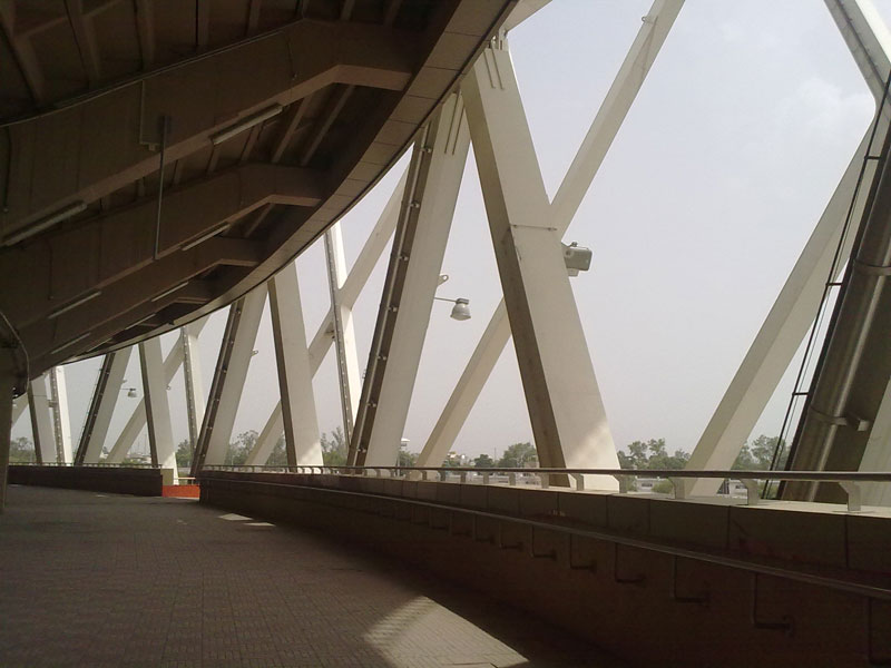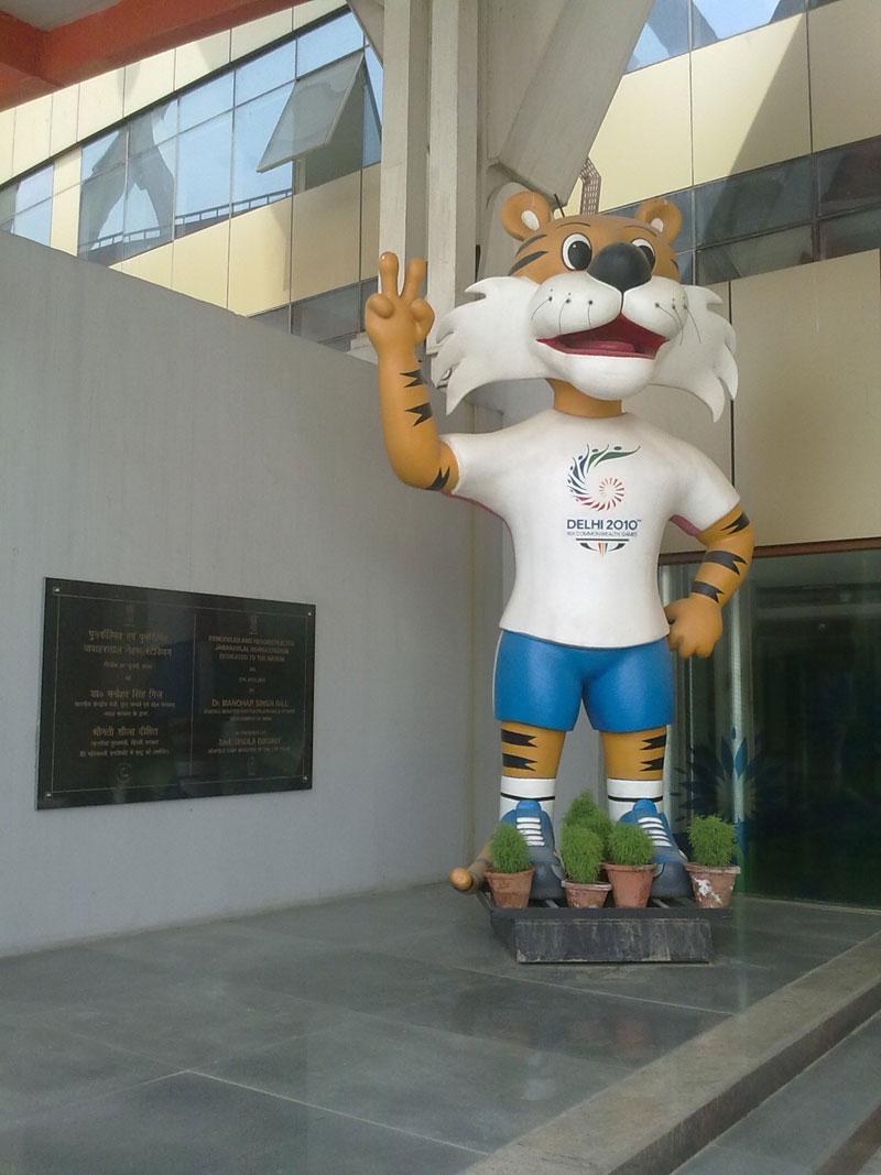 The main stadium has two outer basket-like supporting columned structures carrying not only the compression rings but also the complete ramp system for access and evacuation. The 53,800 m² Teflon-coated roof, designed by Schlaich Bergermann & Partner, was built at a cost of Rupees 308 crore. Taiyo Membrane Corporation supplied and installed the PTFE glass fibre fabric roof. 8,500 tonnes of steel were used in the construction of the stadium's roof and its support structure. A new Electro-Voice professional audio system by Bosch Communications. A new 10-lane synthetic track, synthetic warm-up track, and a synthetic lawn ball field were added. In case of emergency, the construction allows spectators to evacuate within 6 minutes.