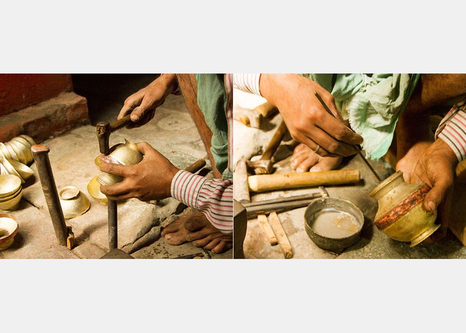When the kamandalu is made in the combination of copper and brass, then the copper portion and the brass top portion of kamandalu are adjusted to each other and fixed tightly by hammering.