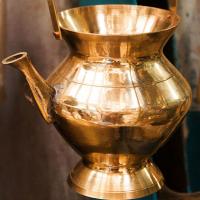 Nowadays Kamandalu is made of brass, copper, silver and also with clay sometimes. Aesthetically speaking it is a beautiful combination of brass and copper. As the copper represents river Jamuna and brass represents river Ganga, this type of Kamandalu is called as Ganga Jamuna Kamandalu. It is a round shaped pitcher with a wide-open neck that has a semicircular handle attached to the mouth of the Kamandalu to facilitate the grip when carried and a snout - through which the water can be poured in a controlled way.