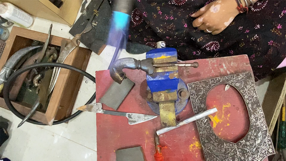 The artwork is done by thin wire of gold and silver on objects made of iron metal like daggers, swords, shields, dagger heads, sticks, etc. First, all the items are heated and excavated with a finely sharpened edge. They turn blue when heated. The style in which it is to be designed is outlined. It is now filled with a hair-like thin gold wire and it is heated and suffocated with a Hukki stone. The wire melts and the design looks beautiful from the outside. This is how Tula Koftgiri's art is done.