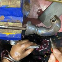The art of decorating arms and weaponry is known as Koftgiri. This art originated in India around 500-700 years ago with the Mughals. An age-old craft is practised in Mewar district. Nowadays it can be seen in Jaipur and Udaipur. Koftgiri refers to the action of ‘beating’ the pattern into iron. Only a few families in Udaipur practice this unique art. One of them was Late. Shri. Rajesh Ghalot. He was practising Koftgiri since his childhood. After his sudden dismissal his wife Smt. Shyamlata Ghalot started practising this art. Both of them have been rewarded with many national and international awards.