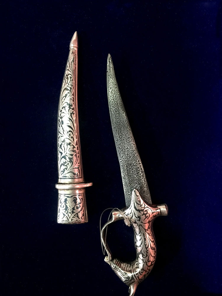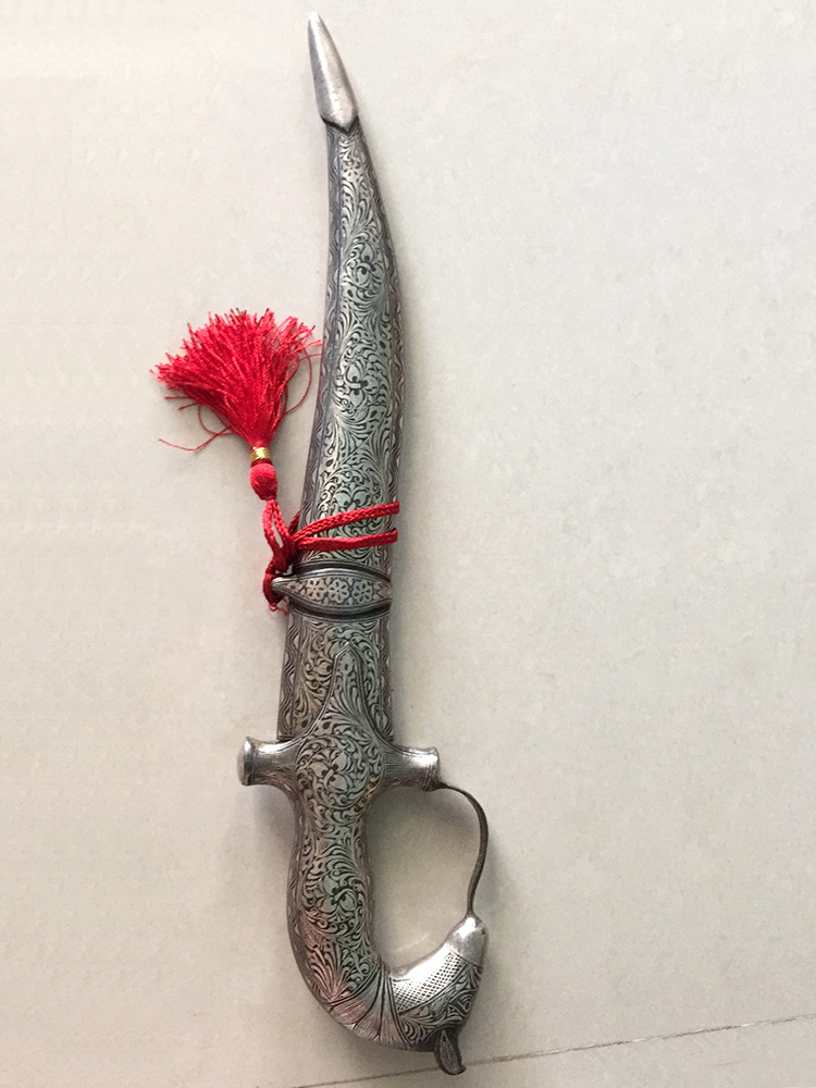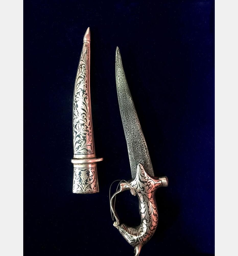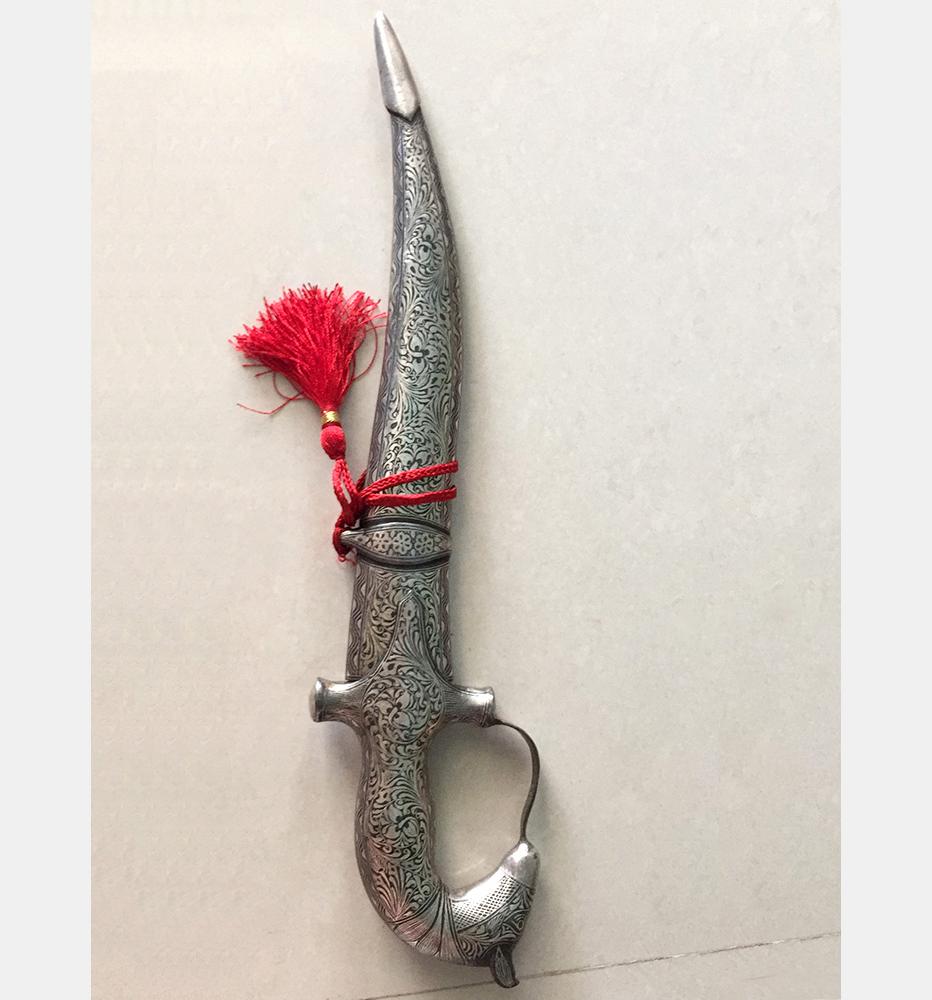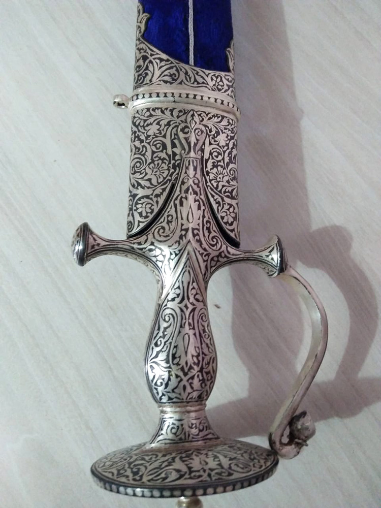 The art of decorating arms and weaponry is known as Koftgiri. This art originated in India around 500-700 years ago with the Mughals. An age-old craft is practised in Mewar district. Nowadays it can be seen in Jaipur and Udaipur. Koftgiri refers to the action of ‘beating’ the pattern into iron. It can be both an inlay and overlay art. It is the art of ornamenting surfaces by inlaying light metal on a dark one using gold or silver wires.