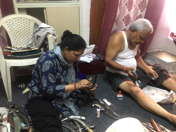 During the Mughal times, Koftgiri artists were killed after finishing their creative work by rulers for not copying their handwork. They don’t want to lose their uniqueness. This created insecurity among artists. To protect the Koftgiri art and the artists' Rajput rulers started hiding Koftgiri artists under their patronage. Since then these artists practising Koftgiri by hiding themselves. Only a few families in Udaipur practice this unique art. One of them was Late. Shri. Rajesh Ghalot. He was practising Koftgiri since his childhood. After his sudden dismissal his wife Smt. Shyamlata Ghalot started practising this art. Both of them have been rewarded with many national and international awards.