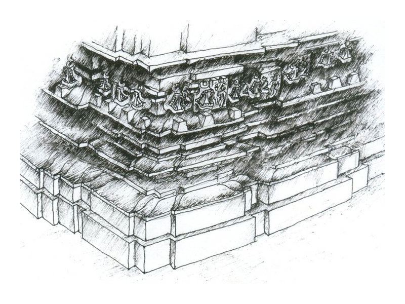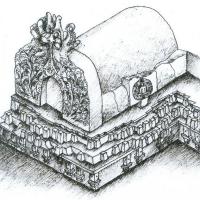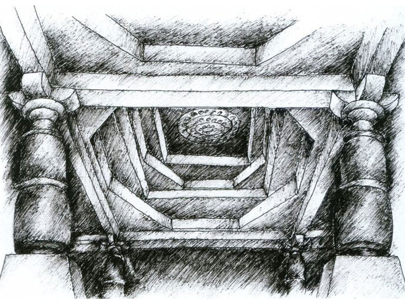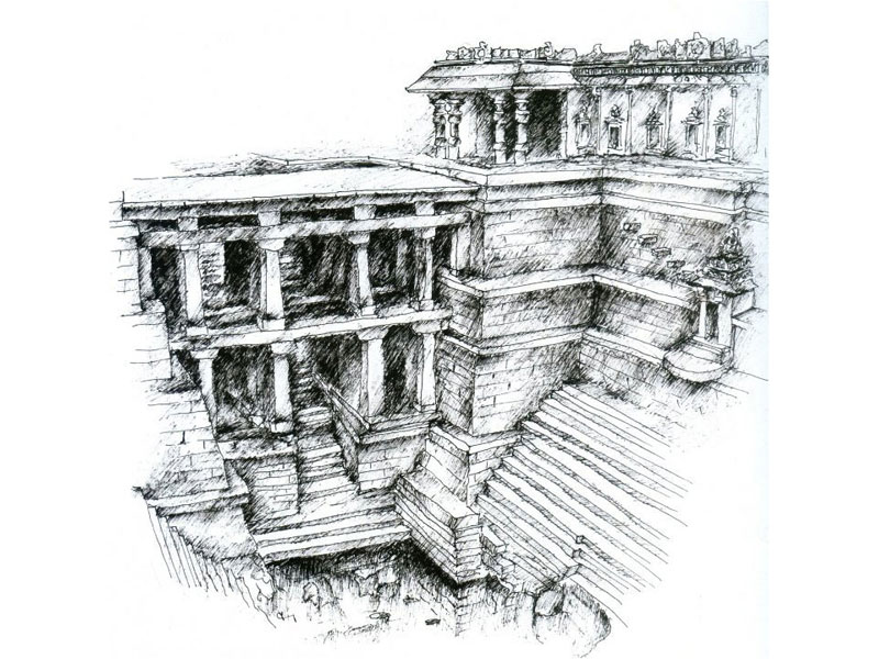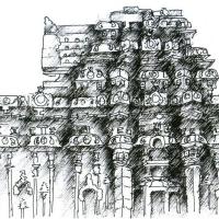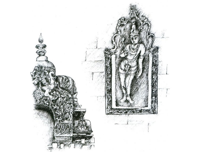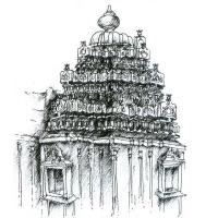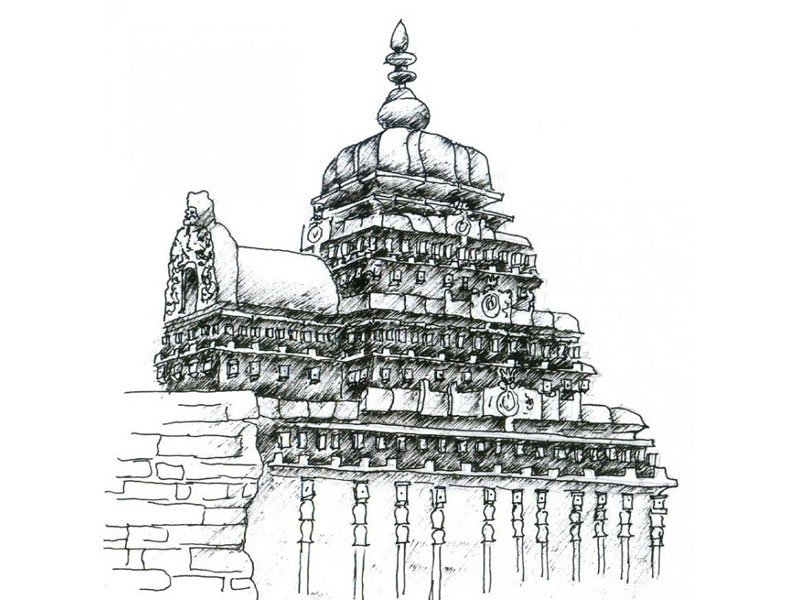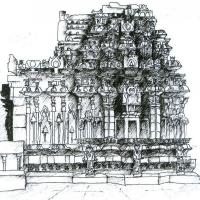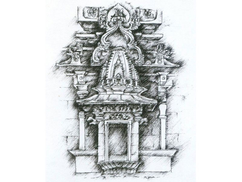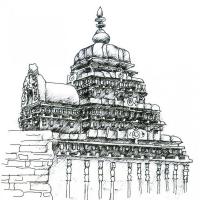 Artist: Puneeth Hegde, IDC, IIT Bombay Technique: Hatching Medium: Ink on Paper These are sketches which depict Jain temple details like pillar, column, plinth, parapet, water spout, keerthi mukha and temple shikhara. Lakkundi is a small village on the way to Hampi (Hospet) from Hubli in Gadag District of Karnataka. All the temples in Lakkundi are made up of green schist and are richly decorated on the outer walls and entrances. One can see the typical of the south-Indian style of architecture in shikhara, an in-between-style type, the parapet and the artistic division of the wall with pilasters.