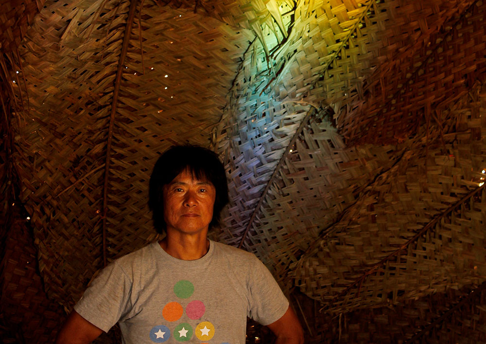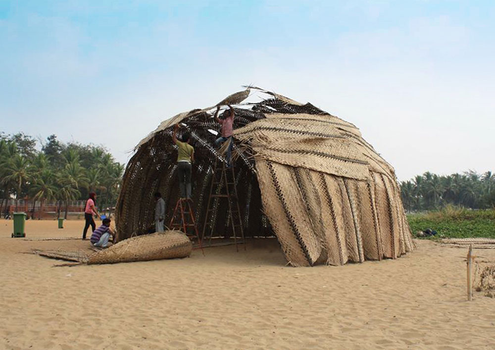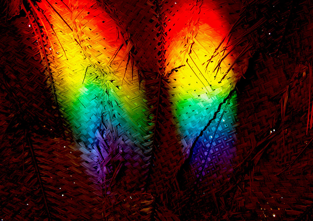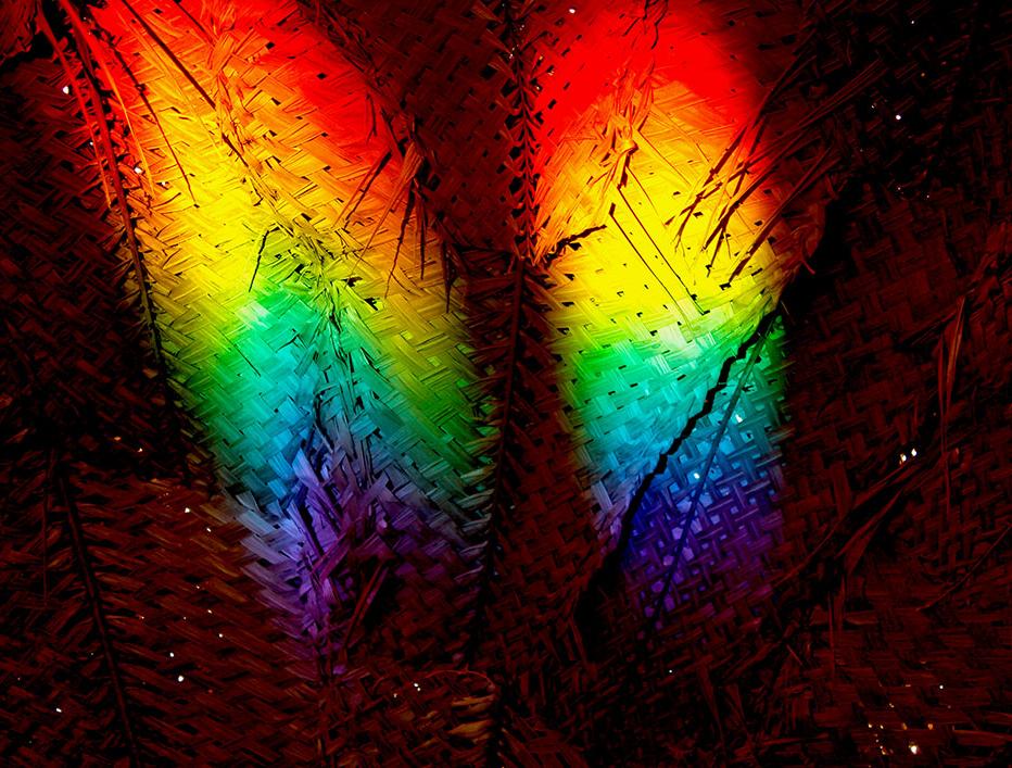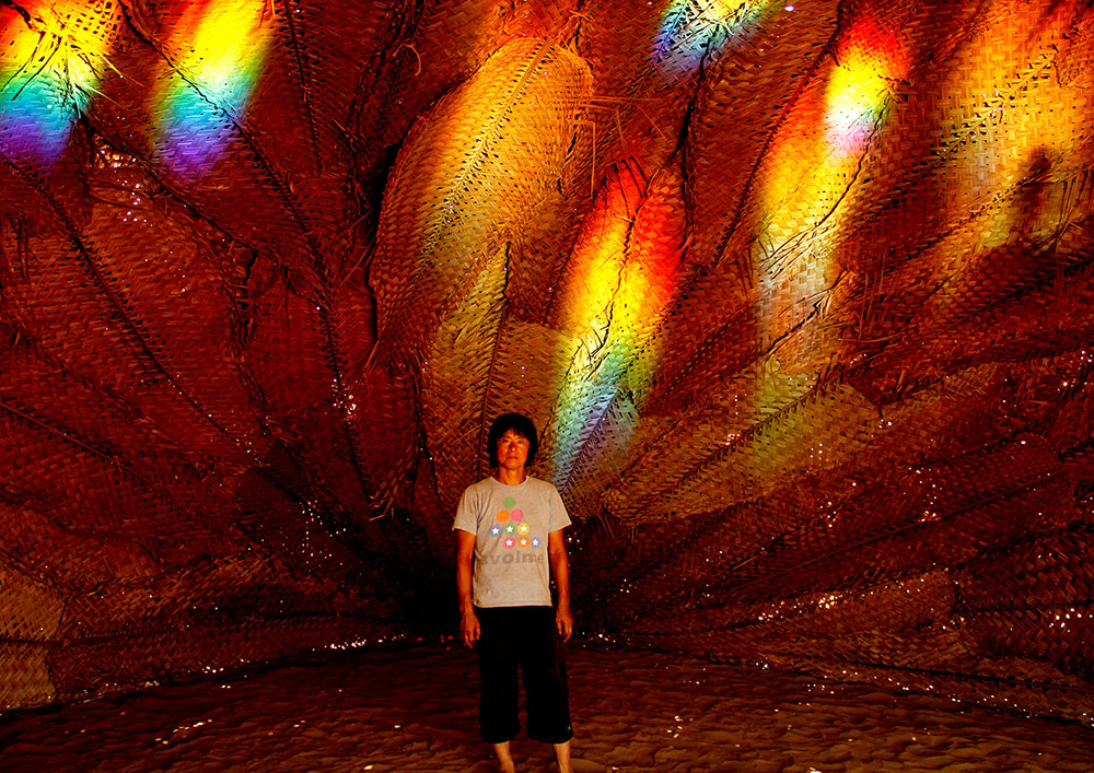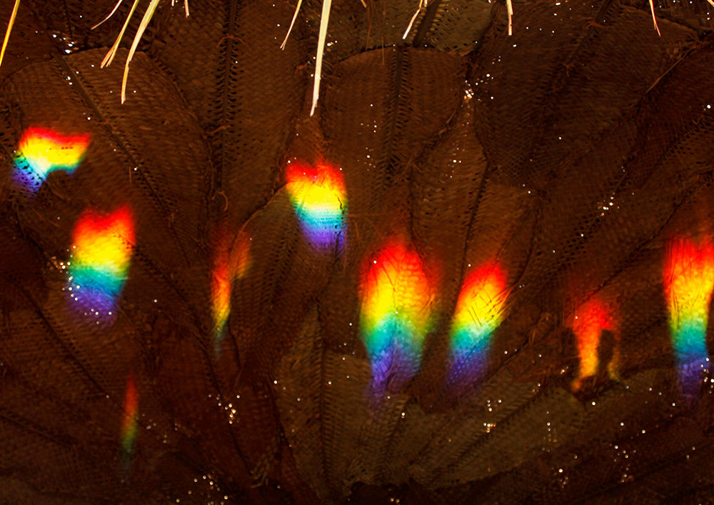The central part of the installation was a simple hut with number of mirrors arranged in front of the entrance in such a way that they create a reflections on the insides of walls of the hut and these reflections were in multiple colors of rainbow.