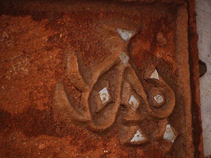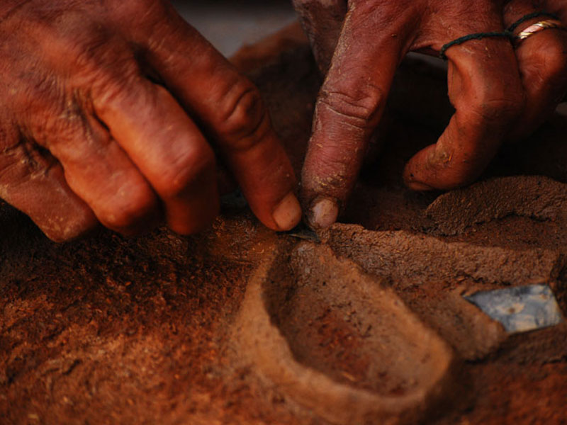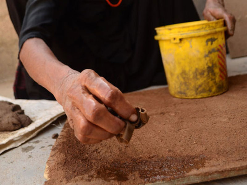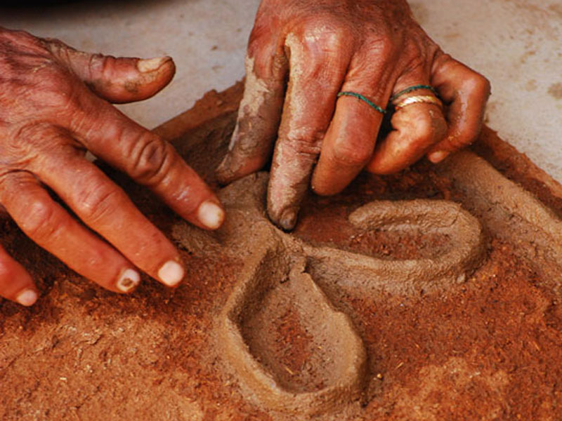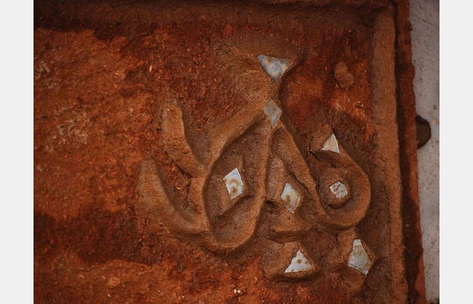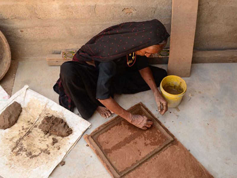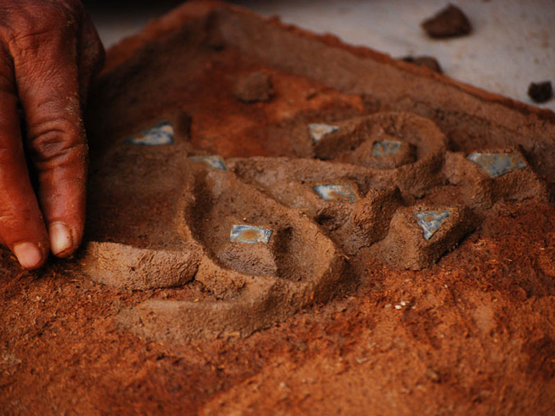 Mud and mirror work also known as Lippan kaam is a traditional mural craft of Kutch. It is also called as Chittar kaam. The walls or the board are plastered with clay and the surface is roughened so that the clay sticks to it. Clay is mixed with donkey dung in equal proportions. This mix is then kneaded into dough. The wooden board is moistened with water so that the clay can stick to it. A border is created to define the area inside of which the clay-designs will be made. Small portions of the dough are taken and shaped into cylinders of varying thickness by rolling between the palms or on the floor. The cylinders are then shaped into lines making different patterns while applying slight pressure with the fingers to stick them onto the wall. Mirrors or mica pieces are cut in a variety of shapes and sizes and fixed on top of the wet clay patterns. After the clay dries off in about 4-5 days, a layer of white clay is painted over the artwork.