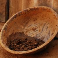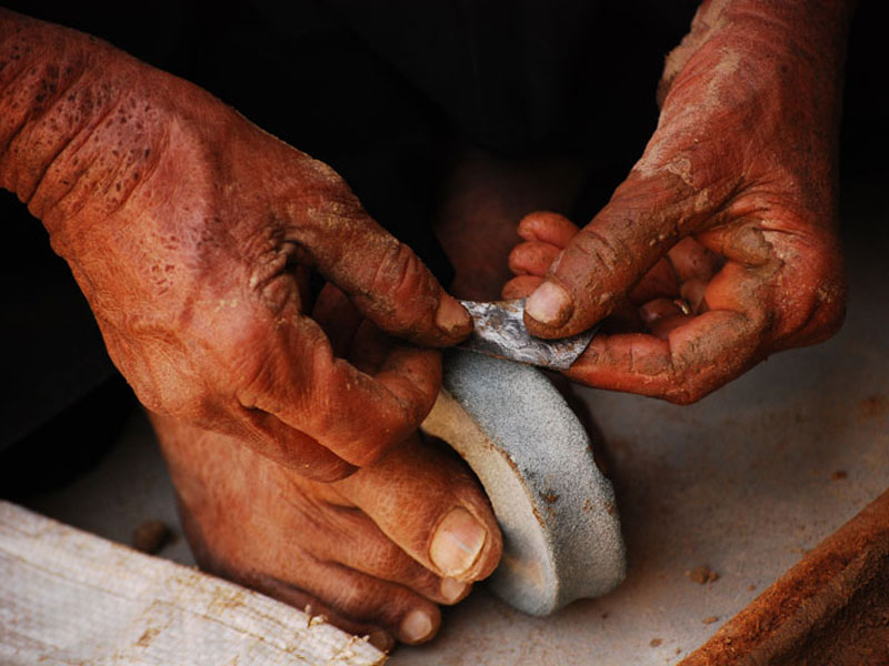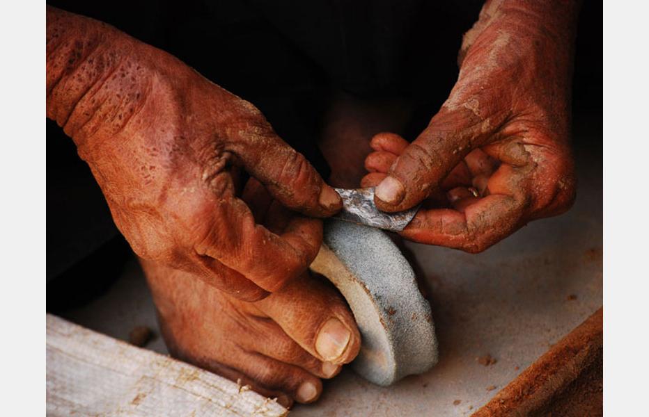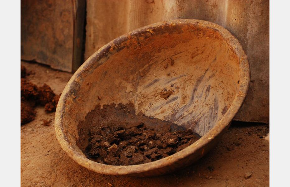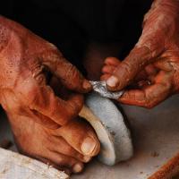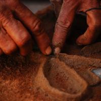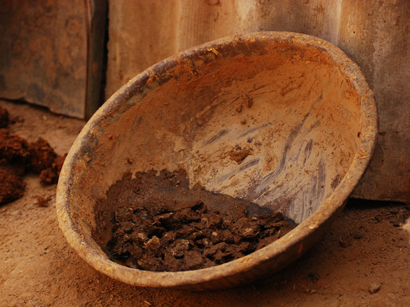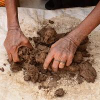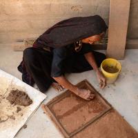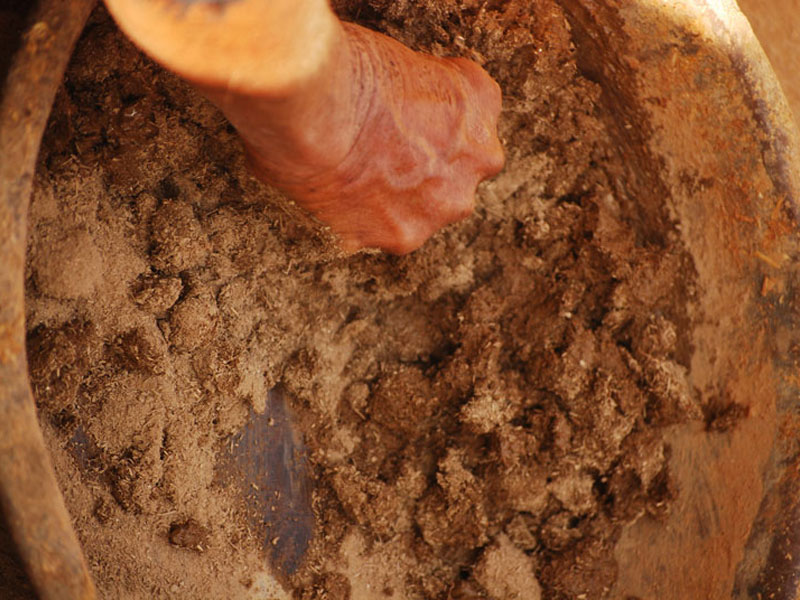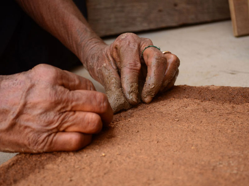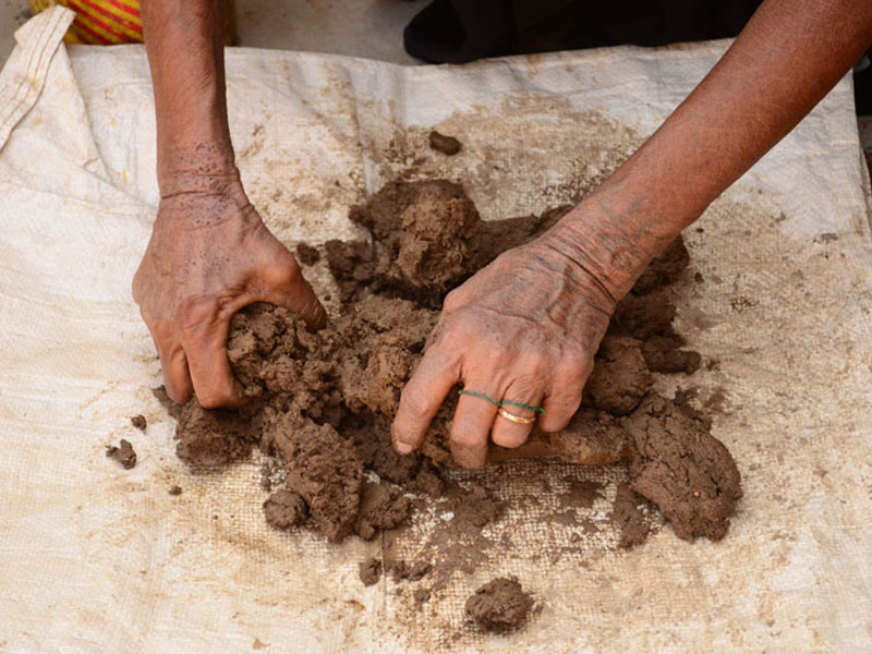 Mud and mirror work also known as Lippan kaam is a traditional mural craft of Kutch. It is also called as Chittar kaam. The walls or the board are plastered with clay and the surface is roughened so that the clay sticks to it. Clay is mixed with donkey dung in equal proportions. This mix is then kneaded into dough. The wooden board is moistened with water so that the clay can stick to it. A border is created to define the area inside of which the clay-designs will be made. Small portions of the dough are taken and shaped into cylinders of varying thickness by rolling between the palms or on the floor. The cylinders are then shaped into lines making different patterns while applying slight pressure with the fingers to stick them onto the wall. Mirrors or mica pieces are cut in a variety of shapes and sizes and fixed on top of the wet clay patterns. After the clay dries off in about 4-5 days, a layer of white clay is painted over the artwork.