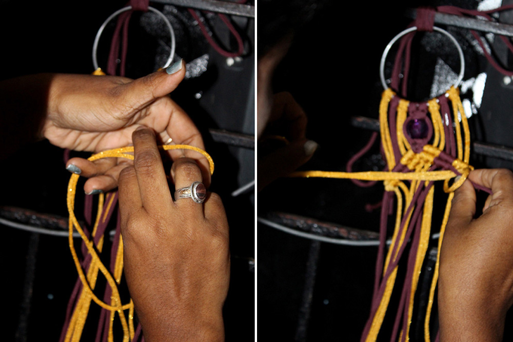Apart from artifacts, home decoration and interior design became the new field for this unique craft. For macrame work, a knotting board is often used to mount the cords. Sometimes a C-clamp, straight pins, T-pins, U-pins, or upholstery pins used for holding cords in place. Beginners' kits, work boards, beads, and materials are available in craft stores for the hobbyist. One such hobbyist who became a professional artist is named Mrs. Sujal Vinod Parab from Bardez. She makes a variety of artifacts. Bardez is a region situated in the northern portion of the state of Goa, India.