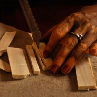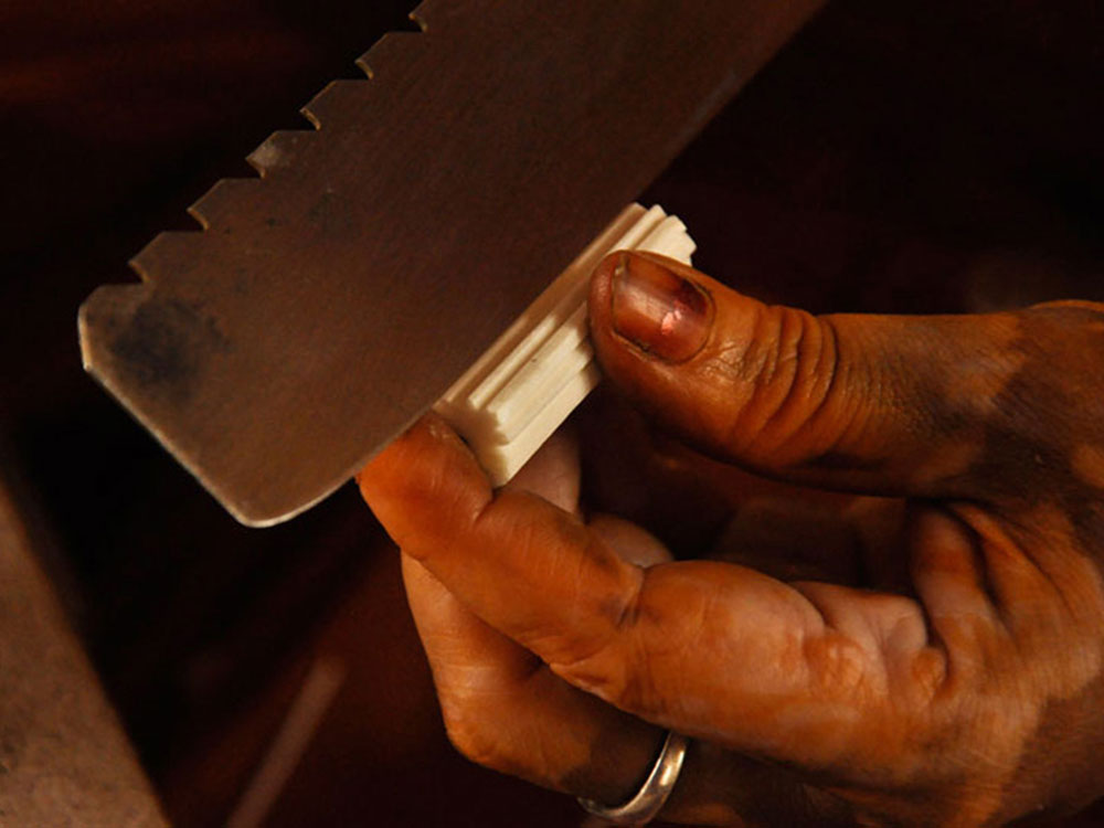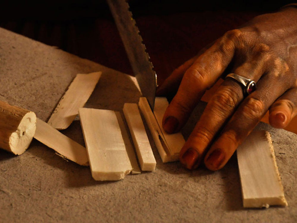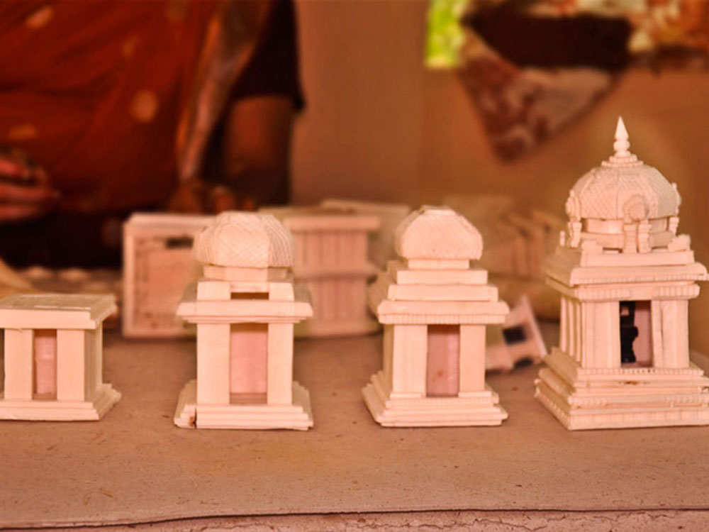 The outer skin of the pith is cut and removed. The inner soft white portion of the stem is used to make the art pieces. The carved pieces are assembled together and stuck with adhesive into one piece of art. Blue prints of the design or photos are used as reference to make the miniatures. It takes one day to make small figures whereas10 to 12 days to finish a detailed designed big Ganesha idol. It takes almost a month to finish set of art piece of a place or temple. Some pith works are painted with water colors to make it look colorful and attractive.