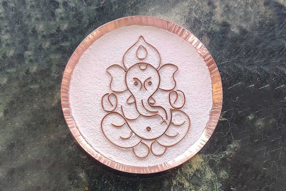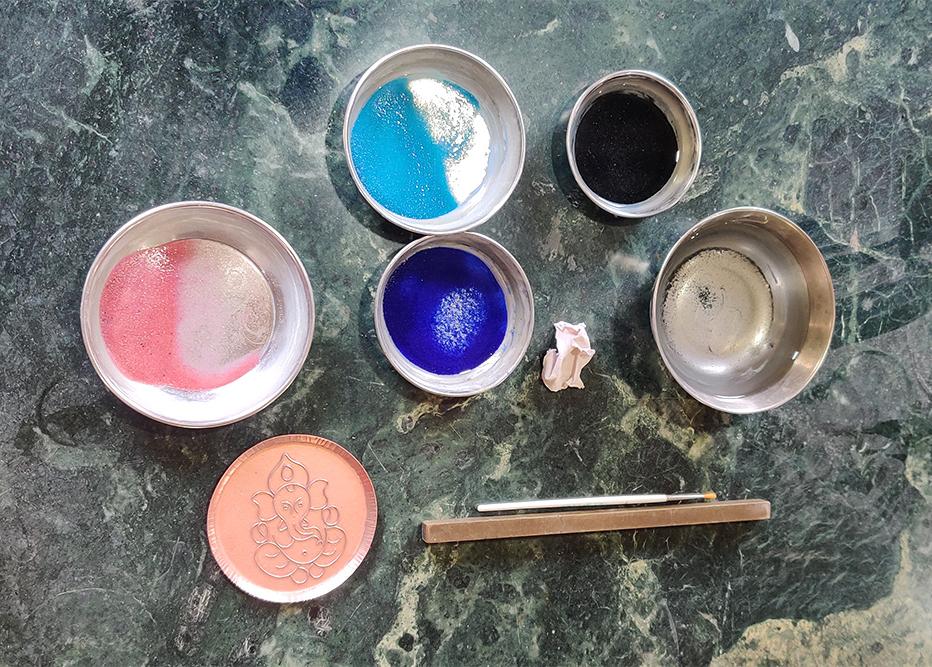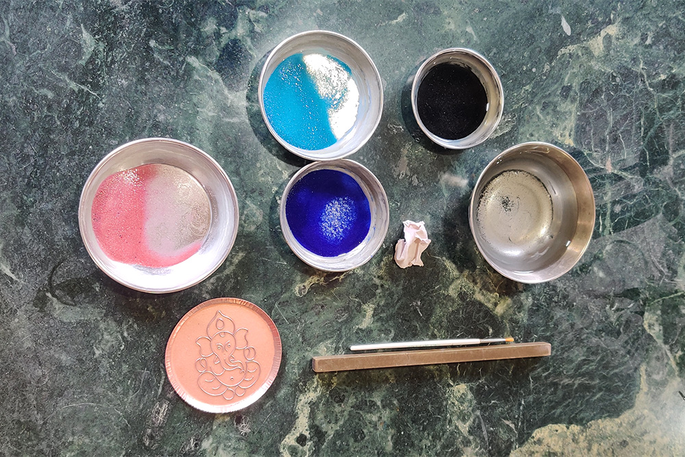 Usually, metals like gold, silver and copper are used for enamelling. The metal articles or jewellery are embellished with colourful enamelling. The powdered glass can be applied either wet or dry to a surface. The colourful glass powder is laid onto the copper surface according to the pattern or design and it is put on high heat to melt the powdered glass. This process results in a coat which is formed on the copper surface. The end result not only lends its vibrant colours to the copper surface but also prevents it from oxidizing.