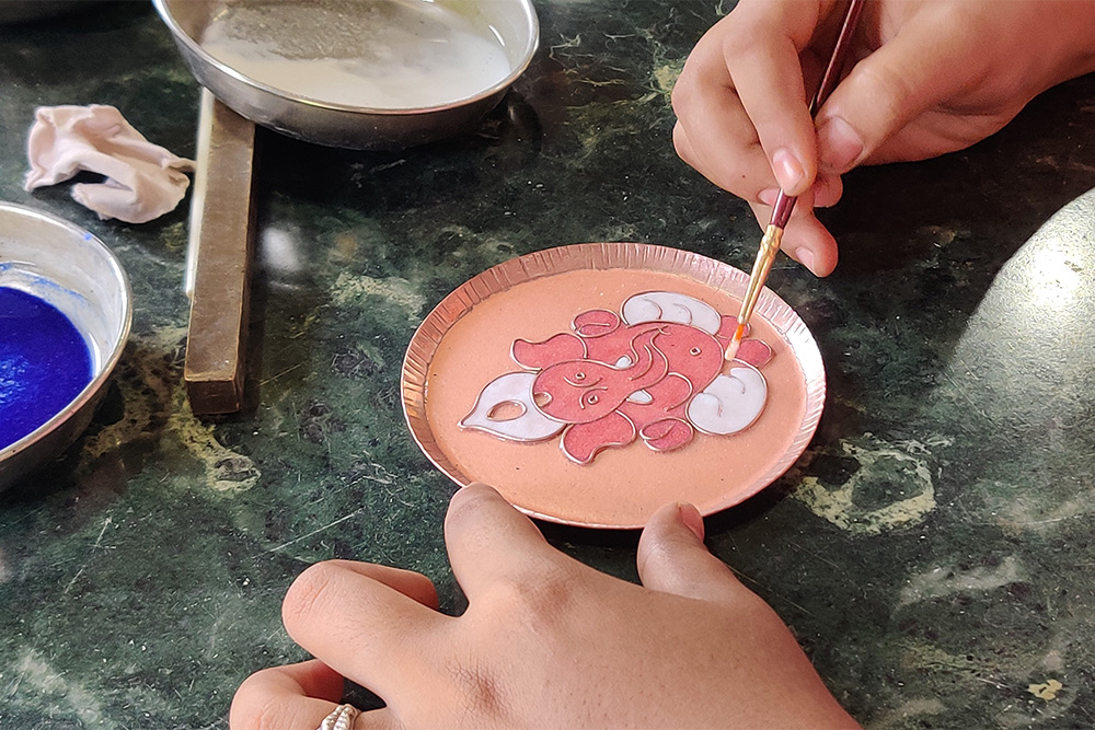 ‘Copper Enamel Arts and Crafts’, a cluster based in a small village known as Bhaimala near Alibag, Raigad district of Maharashtra. It started in the year of 1986 as a small cluster and now it has become a well-known centre for interior designers and art lovers. Master artist Mr Sanjay produces traditional as well as contemporary artefacts. Copper enamelling is a centuries-old craft. It is a process in which powdered glass is fused to a metal surface by using high heat.