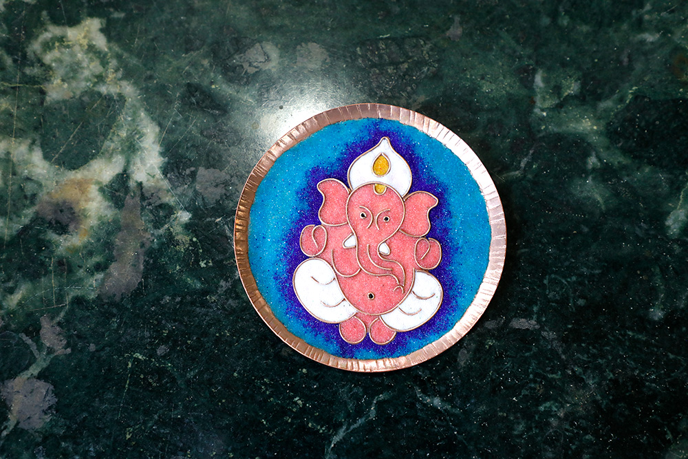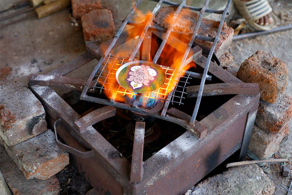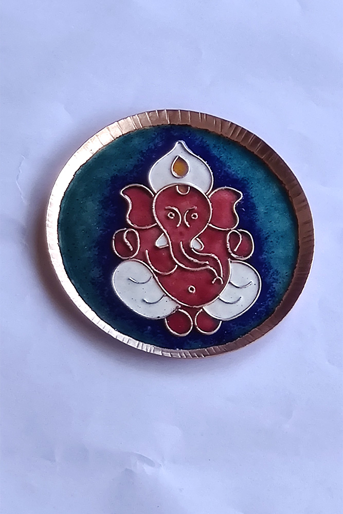 Usually, metals like gold, silver and copper are used for enamelling. The metal articles or jewellery are embellished with colourful enamelling. The powdered glass can be applied either wet or dry to a surface. The colourful glass powder is laid onto the copper surface according to the pattern or design and it is put on high heat to melt the powdered glass. This process results in a coat which is formed on the copper surface. The end result not only lends its vibrant colours to the copper surface but also prevents it from oxidizing.