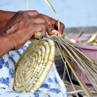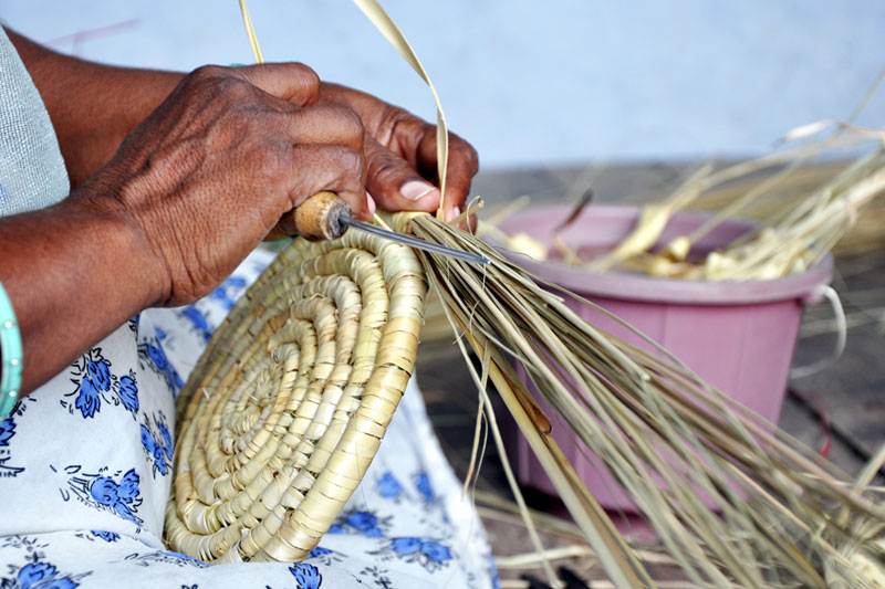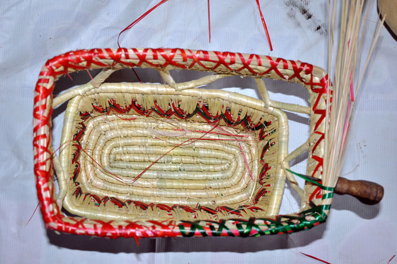 The village Naini in Allahabad is the major producer of Moonj-wild grass products. Moonj and Kaasa are the types of wild grass that richly grows near the banks of the river in and around vast areas of Allahabad. Allahabad, Gorakhpur and Behraich in Uttar Pradesh are the major centers for moonj crafts. Manufacturing process involves simple technique which is skillfully done by using natural grass and basic local made tools. Dyeing is done to color the grass. Kaccha rang -raw colors are used to dye the grass. Water is boiled at high temperature in aluminum container and the color powder is added to it. The dried off-white Moonj grass is immersed in the boiling solution to absorb the color. The grass is removed once it attains color and allowed to dry under shade. The dyed grass is mainly used to create and highlight the motif patterns. Red and green are the two main dominating colors used in basket weaving. The making process is time consuming and basically done by the women at their free time. The traditional coiling technique is used to create the traditional and contemporary products. Dried Moonj grass is made into small knots which are called 'Balla' locally. This Balla is soaked in cold water for some time before coiling to ensure flexibility. The grass Kaasa is used as inside stuffing, wherein Moonj is used to wrap around Kaasa grass to make coil. The formed coil is winded in a series to make the base of basket. Once the base is formed, the walls of the basket are made using the same technique. These coils are stitched together to make the basket strong. The handles of the basket are made and attached by stitching with the grass. More details at: Moonj Basketry Making.