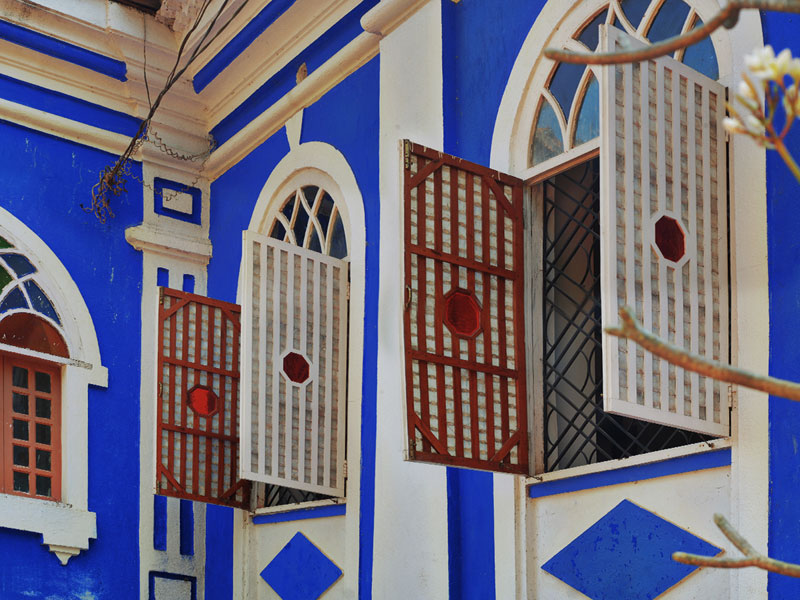 Rebello Mansion in Anjuna, Goa. Artisticallyinstalled sea shells in the window, create a little muted light onto the porches of the otherwise boldly painted house.