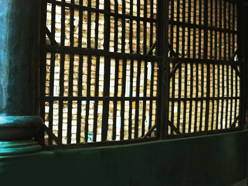 Heritage House, Shioli, North Goa. The nacre of the mother-of-pearl shell is fixed into wooden battens and used to cover windows.Some windows are also made with different opening mechanisms.