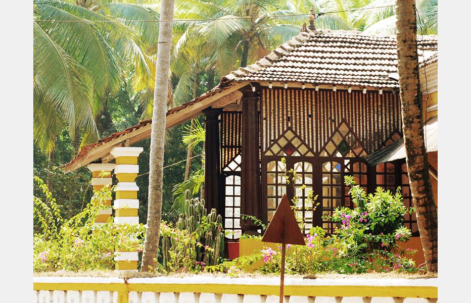 • Rebello Mansion in Anjuna, Goa. Artisticallyinstalled sea shells in the window, create a little muted light onto the porches of the otherwise boldly painted house.