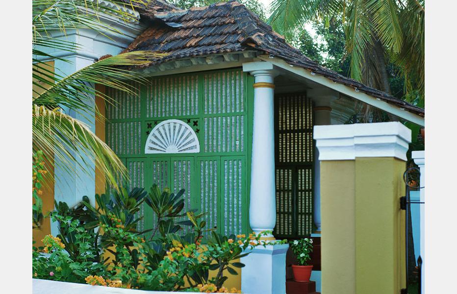 House in Shioli, North Goa. An example of the traditional upper- class Goan housewhich has a beautifully made porchedentrance created by using shell and stained glass windows on both sides.
