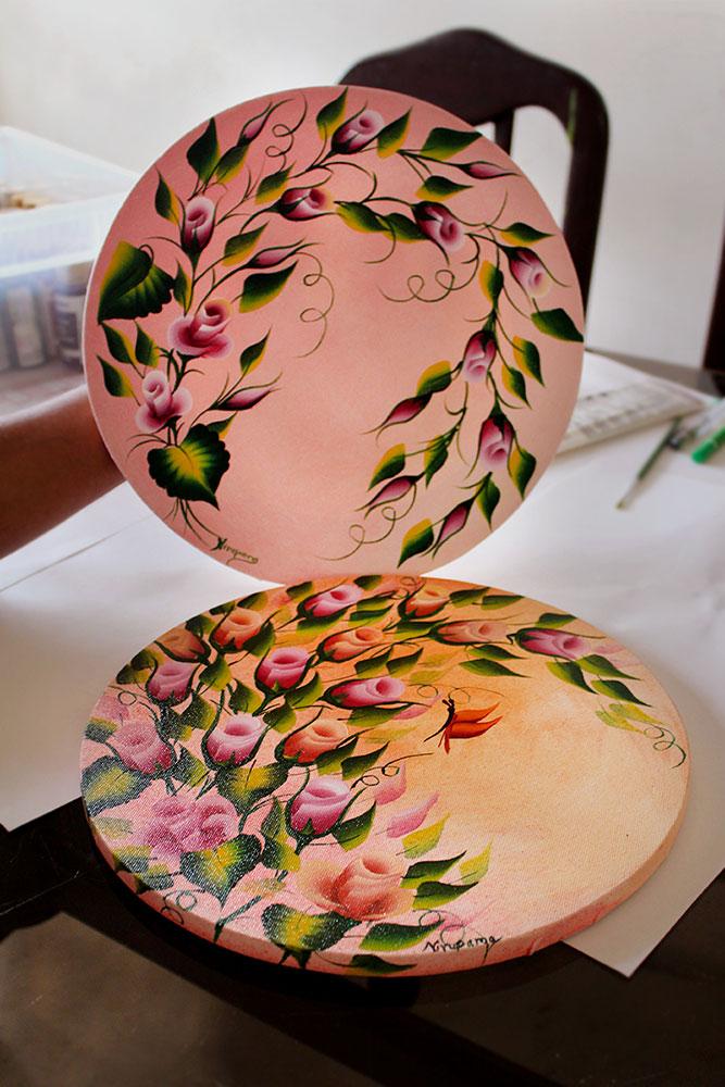 Donna Dewberry, an American artist, claims that she is the inventor and developer of the ‘One stroke’ painting technique. The one-stroke style is required for decorating furniture or for decorating pottery. One-stroke painting is usually based on natural themes like flowers, fruits, birds, butterflies, and dual shade scenarios, which are water, mountain, sky, etc. One stroke painting cannot be painted with any other theme than nature because the shading and highlighting can be painted with one stroke, which is not possible with any other different elements. Artist Mrs. Nirupama Chirmade from Bengaluru is painting for the past 15 years. She was inspired by Donna Dewberry and learned it from her in California, United States of America.