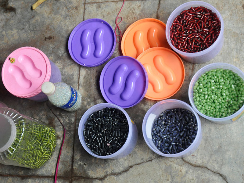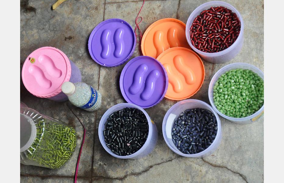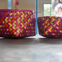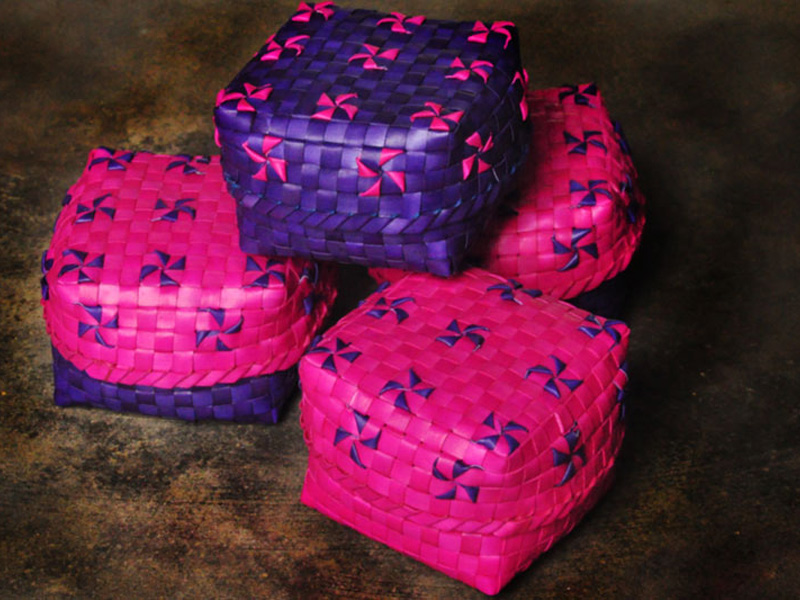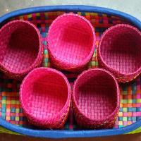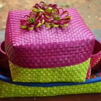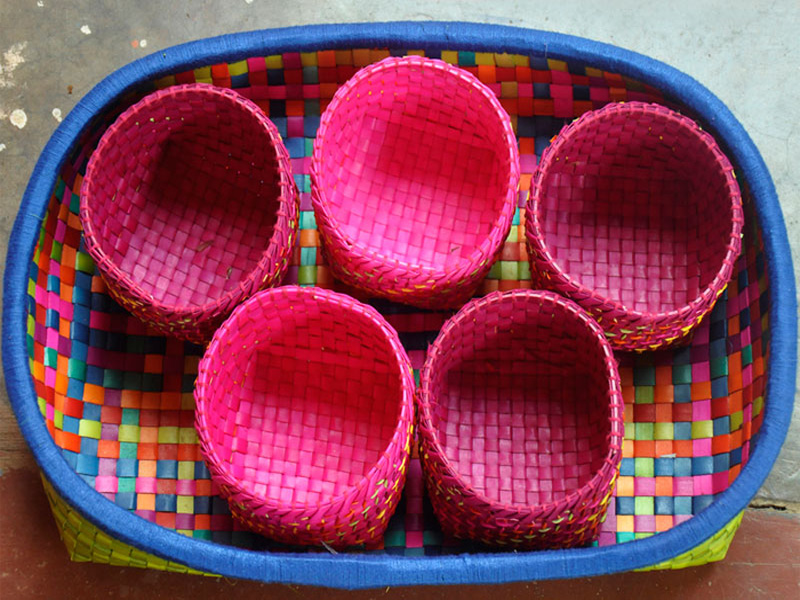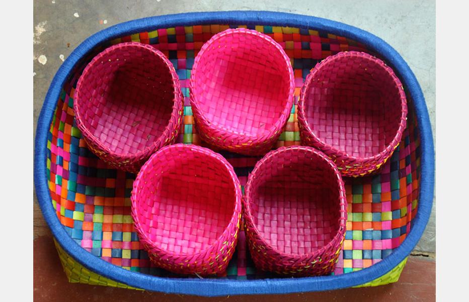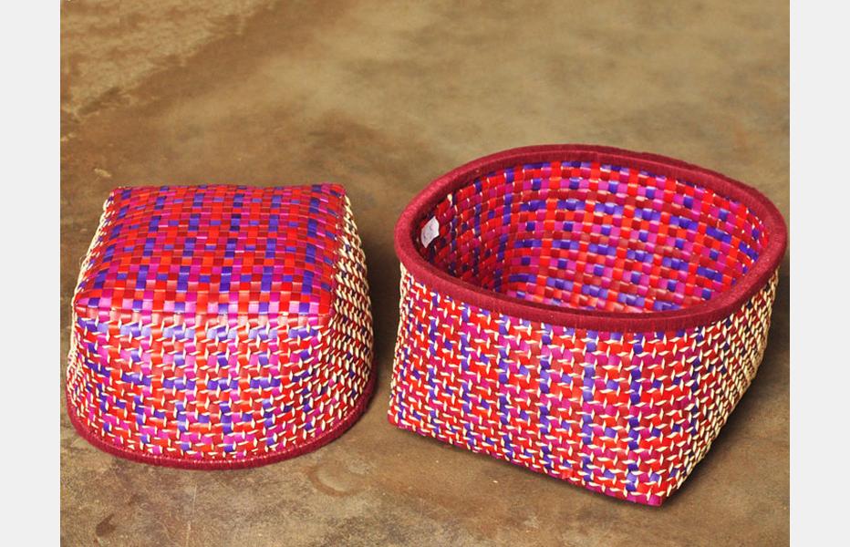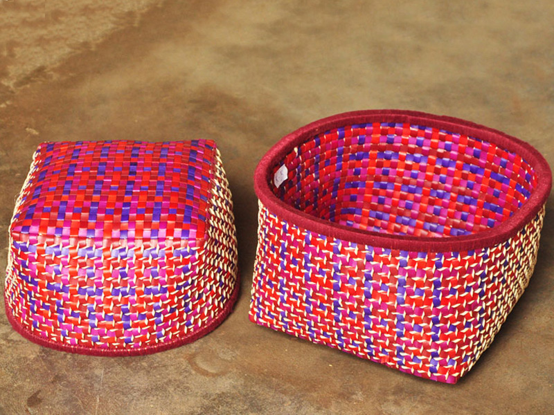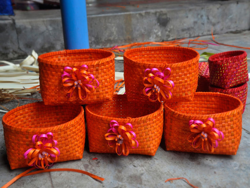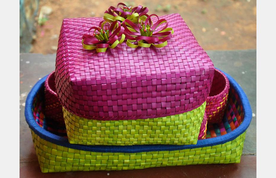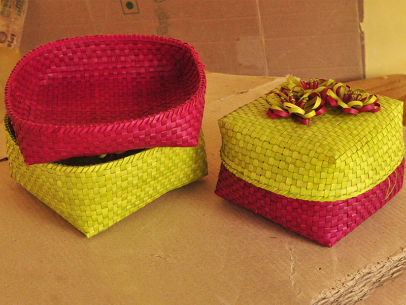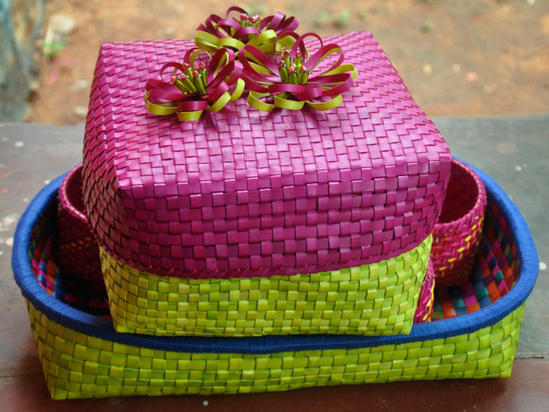 Varieties of products are made using the palm leaf such as baskets, fruit baskets, mats, pen stands, flower vases and gift boxes. The baskets are used for multi purposes as storage containers as well as decorative items. Different colors are used for the products, which are very eye-catching. New innovation with designs and patterns according to the modern customers taste are made to increase the market for these products. Colorful beads are added to the products, which enhances the beauty of the products. The products made are durable for many years and washable.