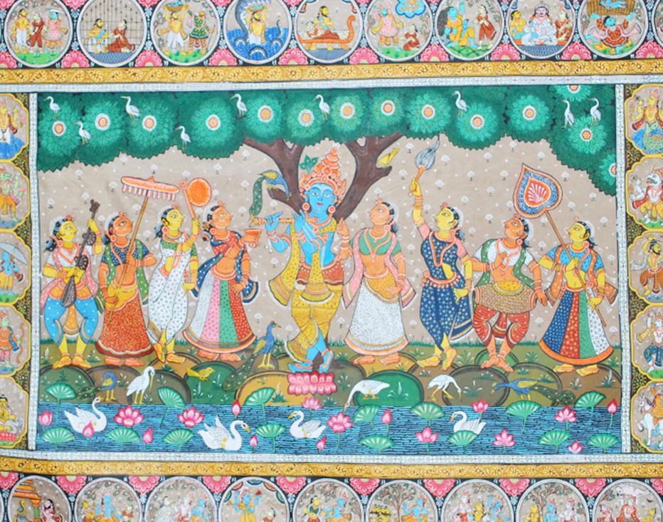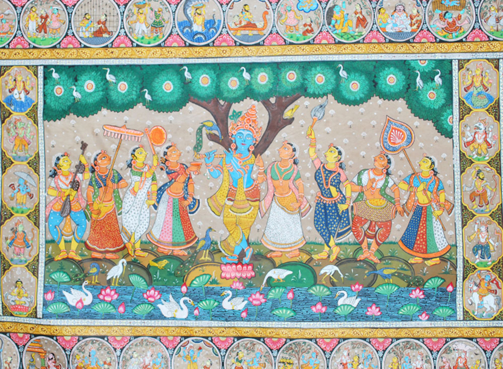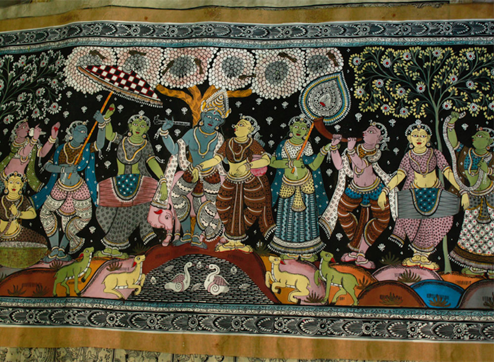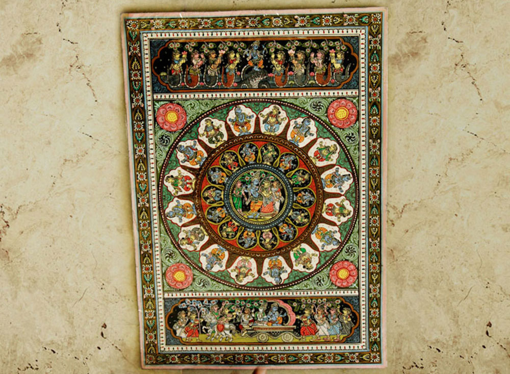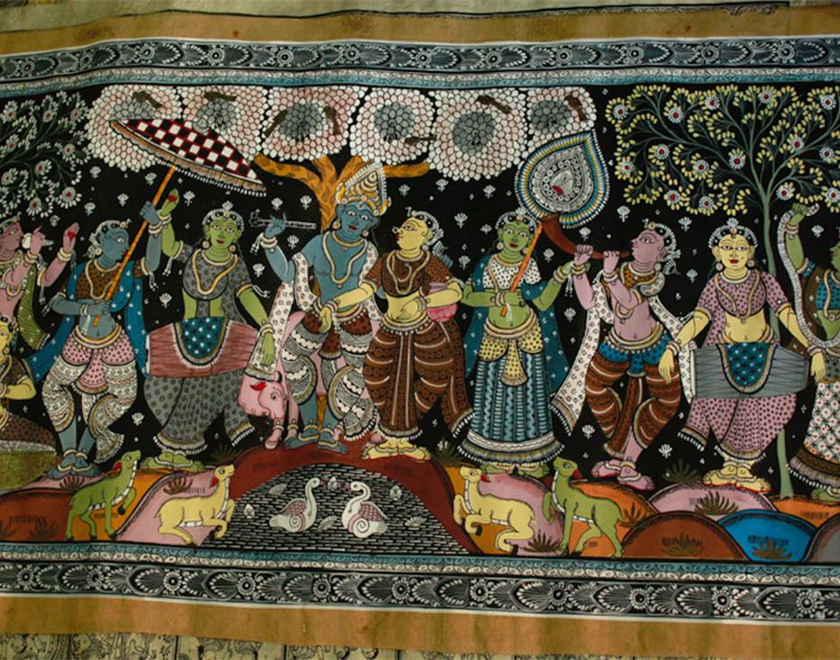 This tradition is inherited in the form of a family sketch book, handed down over generations and cherished as a precious sacred possession. The bold lines, the bright colours and the fine pictorial conceptions distinguish this art form from the rest. Its uniqueness lies in its overall finesse and rhythmic juxtaposition of elements. A typical feature being the intricate borders embellishing the central theme of every Pata painting, usually in red and involving floral motives. There is an interesting mix of folk as well as classical elements.