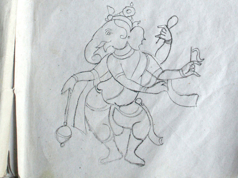 The Pattachitra artists or ‘Chitrakaars’ use different hand drawn sketches for reference and practice. These are handed over in the form of a family sketch book, over generations and cherished as a precious sacred possession. The younger artists are given rigorous training over years to internalize the style such that when they start practice, the typical features are maintained. When one becomes an expert in the field and start teaching and educating others he ensures that the new learners practice the same sketches which he had learnt from his teacher in the early stage of his career.