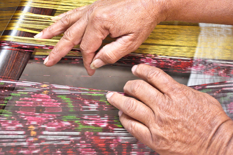 • Plain color dyed threads are added in the warp where it is required.