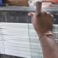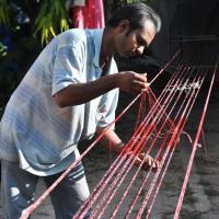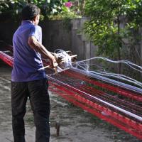 • The dyed yarn is arranged to an iron pole for warping process.