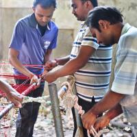 The warp is attached to loom and the weaving is begun.