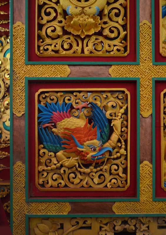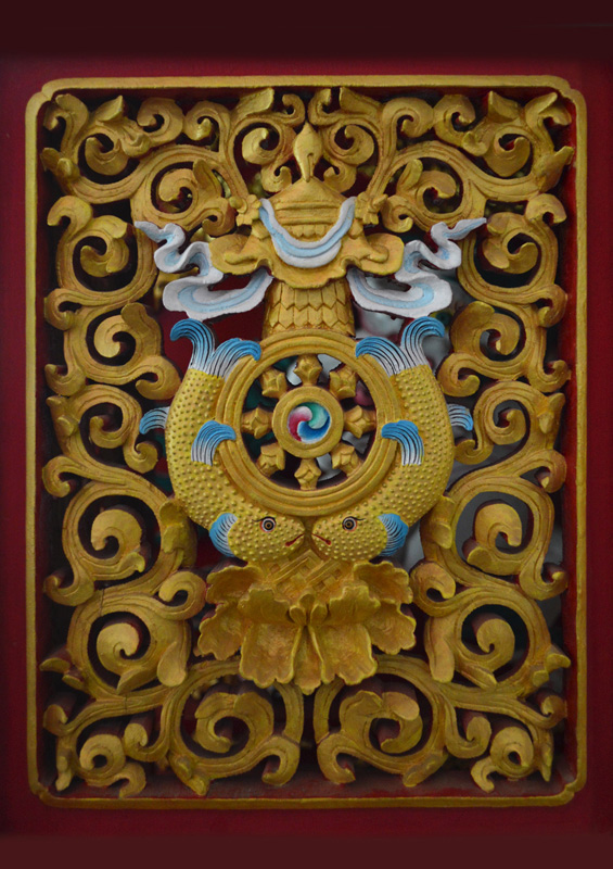 A synthesis of all eight symbols of Buddhism can be seen carved on this gold painted cupboard.