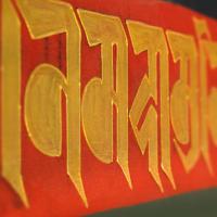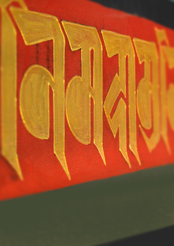 The chant written in the Bodhi script runs along the walls, as a border with delicate tube work.