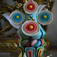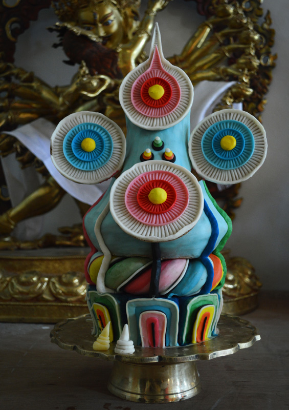 A beautifully made 'Torma' or offering made from barley and yak butter placed before Lord Buddha.