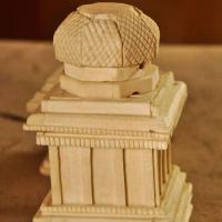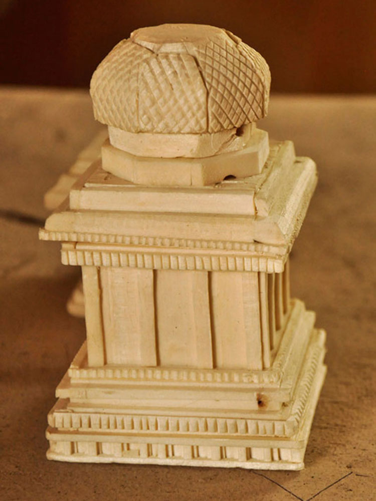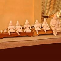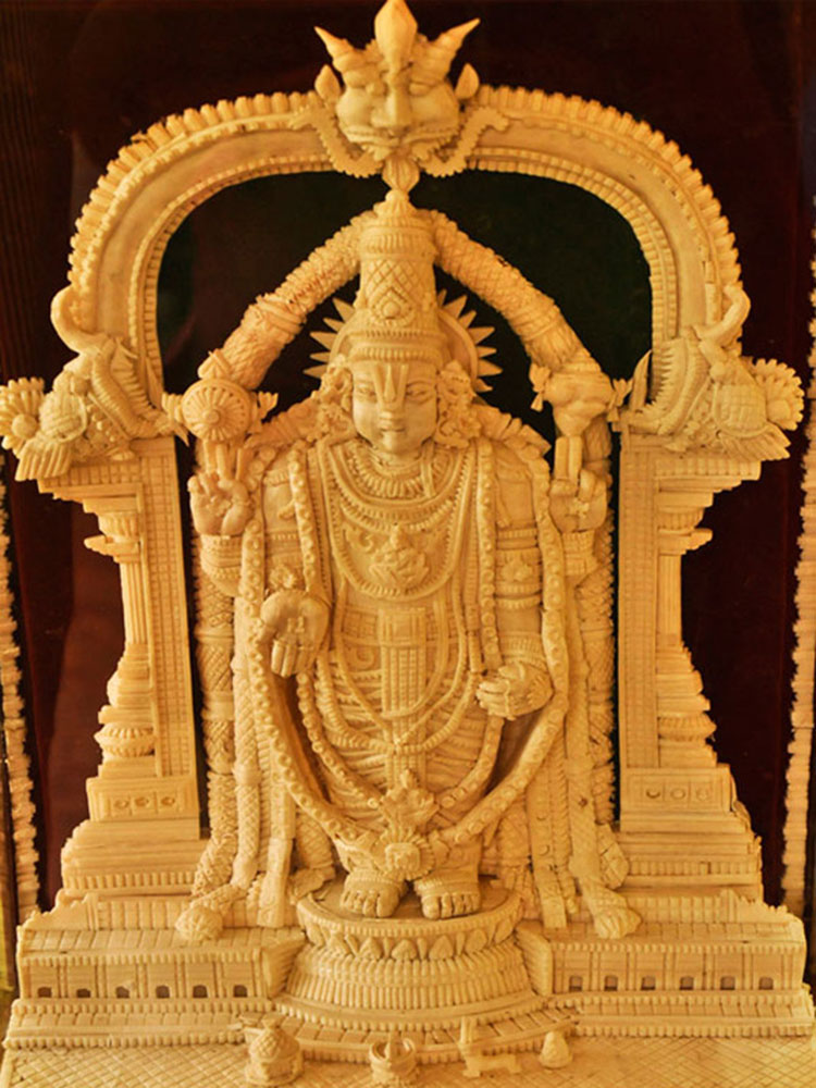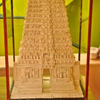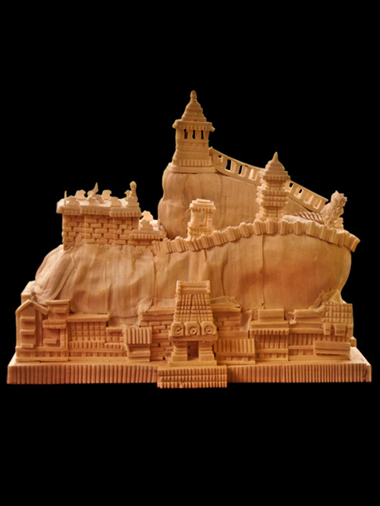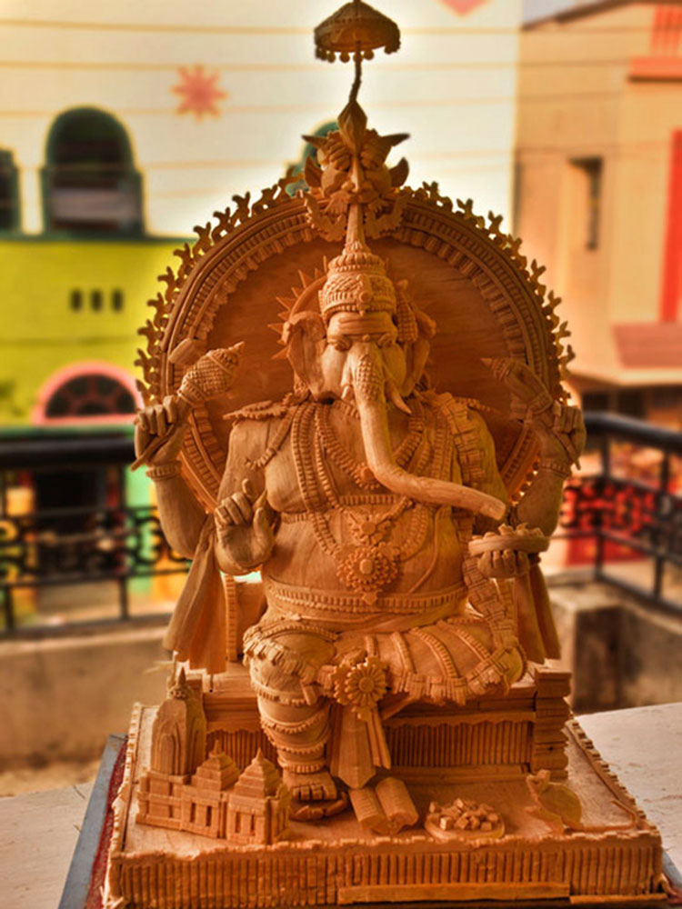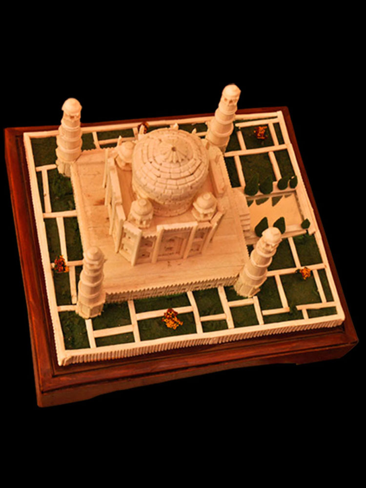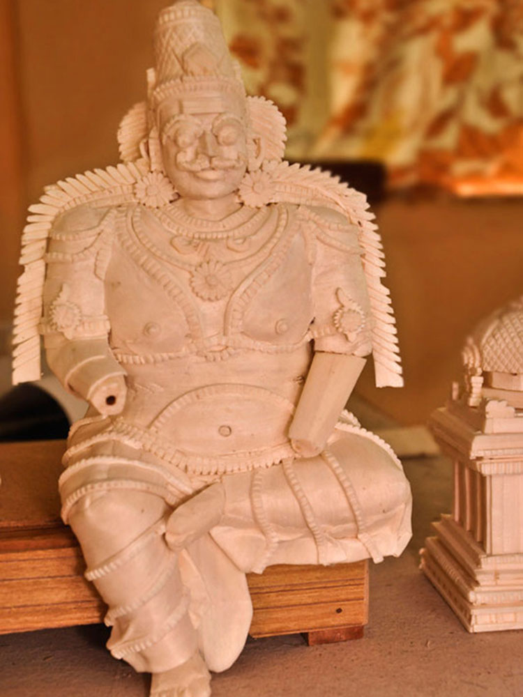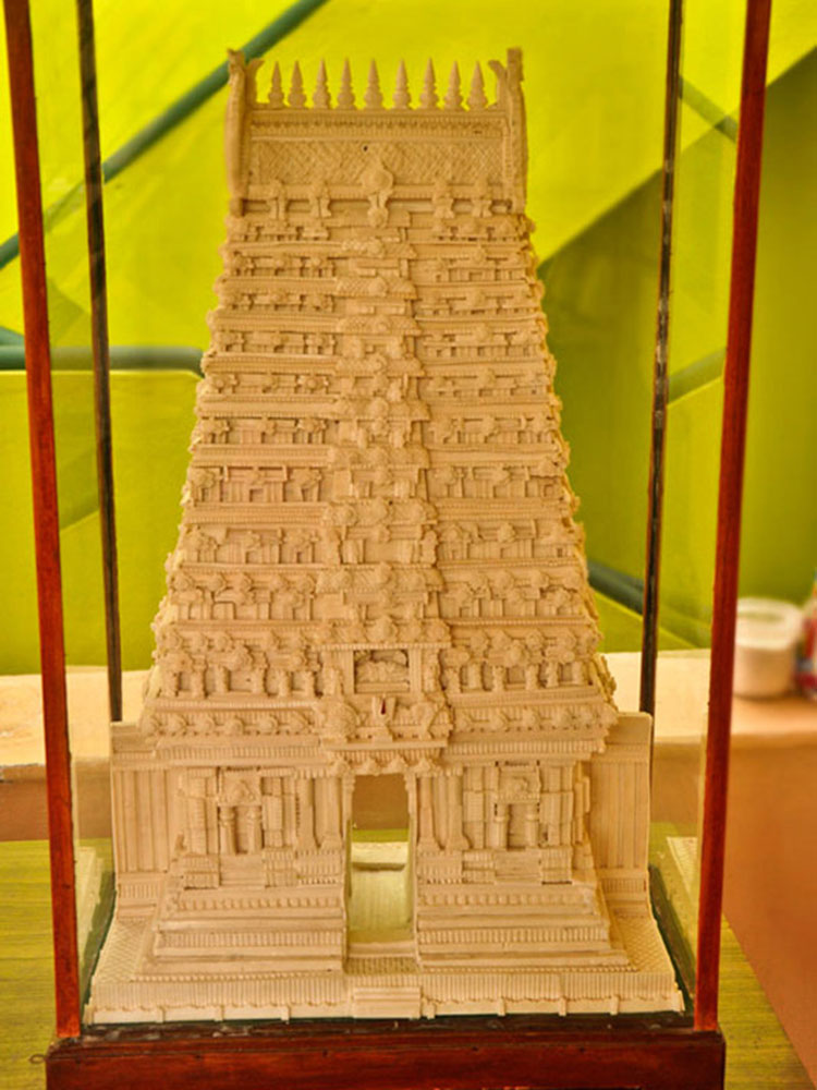 The main art pieces are the miniatures of Thanjavur temples. The other art pieces are idols of god and goddesses, Taj Mahal, Brihadeshvara Temple, Tirupathi Temple, Madurai Menakshi idol and temple, miniature models of rural and city places and home decoration items. To avoid from dust the product is covered with a glass case/frame which preserves the product for more than 20 years.