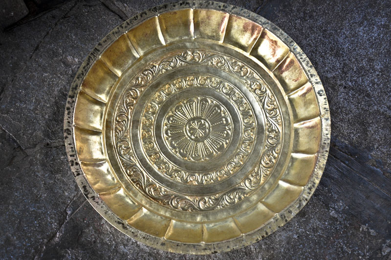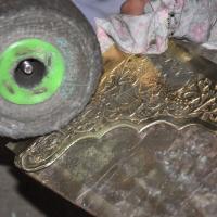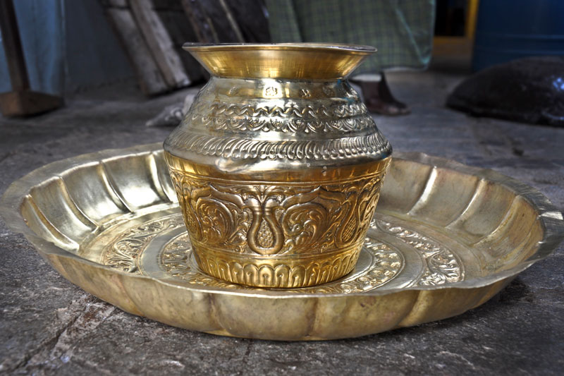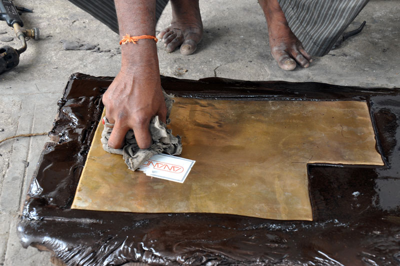 After the basic carving the paper sheet is removed. Later the lac is heated and the carved brass sheet is removed from the wooden plank. Further fine carvings are done by hammering the sheet with different shape and sizes of chisels. Later the sheet is cleaned with ash powder and the depth of the embossing is done. Parts of the product are designed and embossed separately and later welded together using gas torch burner. The embossed sheet is then washed with acid and brushed with tamarind water giving the article shine. After washing it is filed to smoothen the edges and buffed to give shine and luster to the surface.