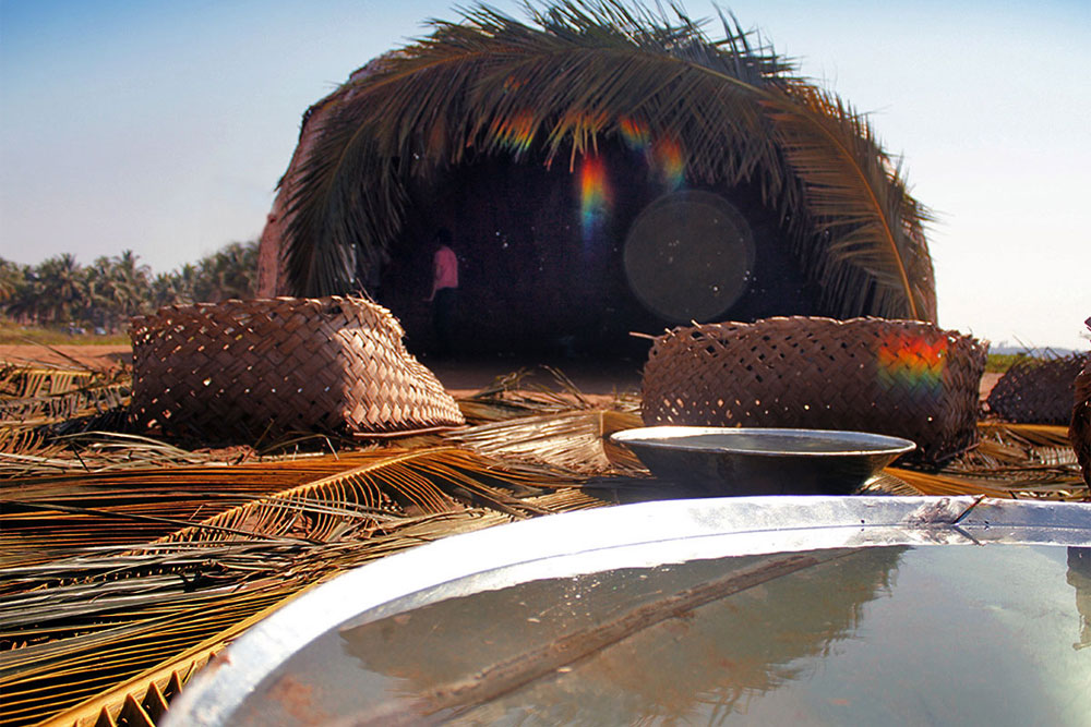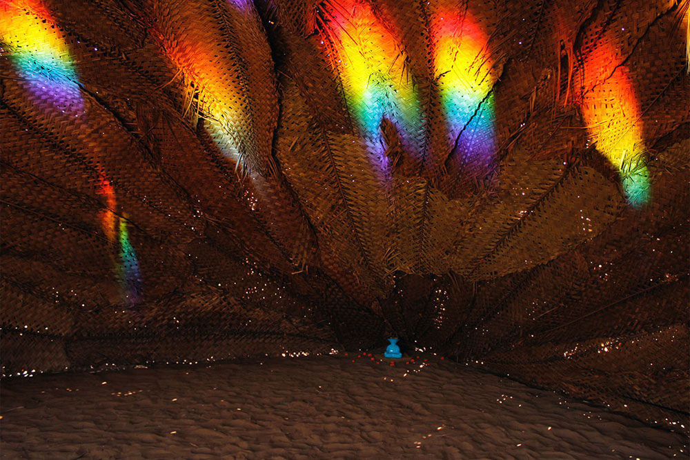 This Installation is mostly made out of natural materials that function as a dark and shaded screen on which rainbow refractions are projected through the use of sun light, water and mirrors. The Rainbow-hut wants to give birth to an empty space, a space of encounter. As the result of the coloured light coming into the hut, the rainbow-hut defines a space which didn't exist before and which is not codified by social-economical standard rules or by any predefined purpose. Different relationships and activities related to music and art take place in the hut but none of them is foreseen. They take place freely and spontaneously in this space of encounter.